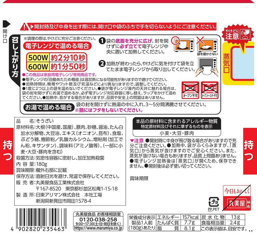 大根(中国産、国産)、豚肉、砂糖、醤油、たん白加水分解物、大豆油、エキス(オニオン、昆布)、食塩、ぶどう糖、鰹節粉/乳酸カルシウム、増粘剤(加工でん粉、キサンタン)、調味料(アミノ酸等)、(一部に小麦・大豆・豚肉を含む)