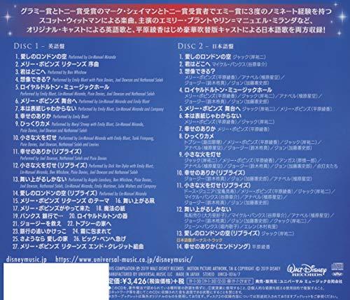 ★デラックス盤は、英語盤と日本語盤の両方が収録が収録された2枚組み仕様。(日本語版は歌唱曲のみ)【DISC 1】1. “(Underneath the) Lovely London Sky" 愛しのロンドンの空 - Performed by Lin-Manuel Miranda2. “Overture" メリー・ポピンズ リターンズ 序曲 - Performed by Marc Shaiman3. “A Conversation" 君はどこへ - Performed by Ben Whishaw4. “Can You Imagine That?" 想像できる?- Performed by Emily Blunt with Pixie Davies, Joel Dawson and Nathanael Saleh5. “The Royal Doulton Music Hall" ロイヤルドルトン・ミュージックホール - Performed by Emily Blunt, Lin-Manuel Miranda, Pixie Davies, Joel Dawson and Nathanael Saleh6. “Introducing Mary Poppins" メリー・ポピンズ 舞台へ - Performed by Lin-Manuel Miranda and Emily Blunt7. “A Cover Is Not the Book" 本は表紙じゃわからない - Performed by Emily Blunt and Lin-Manuel Miranda and Company8. “The Place Where Lost Things Go" 幸せのありか - Performed by Emily Blunt9. “Turning Turtle" ひっくりカメ - Performed by Meryl Streep with Emily Blunt, Lin-Manuel Miranda, Pixie Davies, Joel Dawson and Nathanael Saleh10. “Trip a Little Light Fantastic" 小さな火を灯せ - Performed by Lin-Manuel Miranda with Emily Blunt, Tarik Frimpong, Pixie Davies, Joel Dawson, Nathanael Saleh and Leeries11. “The Place Where Lost Things Go (Reprise)" 幸せのありか(リプライズ)- Performed by Joel Dawson, Nathanael Saleh and Pixie Davies12. “Trip a Little Light Fantastic (Reprise)" 小さな火を灯せ(リプライズ)- Performed by Dick Van Dyke with Emily Blunt, Lin-Manuel Miranda, Ben Whishaw, Pixie Davies, Joel Dawson and Nathanael Saleh13. “Nowhere to Go But Up" 舞い上がるしかない - Performed by Angela Lansbury, Ben Whishaw, Pixie Davies, Joel Dawson, Nathanael Saleh, Lin-Manuel Miranda, Emily Mortimer, Julie Walters and Company14. “(Underneath the) Lovely London Sky (Reprise)" 愛しのロンドンの空(リプライズ)- Performed by Lin-Manuel Miranda15. “Theme from Mary Poppins Returns" メリー・ポピンズ リターンズ のテーマ - Performed by Marc Shaiman16. “Kite Takes Off" 舞い上がる凧 - Performed by Marc Shaiman17. “Mary Poppins Arrives" メリー・ポピンズがやって来た - Performed by Marc Shaiman18. “Magic Papers" 魔法の紙 - Performed by Marc Shaiman19. “Banks in the Bank" バンクス 銀行で… - Performed by Marc Shaiman20. “Into the Royal Doulton Bowl" ロイヤルドルトンの器 - Performed by Marc Shaiman21. “Rescuing Georgie" ジョージーを救え - Performed by Marc Shaiman22. “Off to Topsy's" トプシーの家へ - Performed by Marc Shaiman23. “Chase Through the Bank" 銀行の追いかけっこ - Performed by Marc Shaiman24. “Lost in a Fog" 霧に包まれて - Performed by Marc Shaiman25. “Goodbye Old Friend" さようなら 愛しの家 - Performed by Marc Shaiman26. “Race to Big Ben" ビッグ・ベンへ急げ - Performed by Marc Shaiman27. “End Title Suite" メリー・ポピンズ リターンズ エンド・クレジット組曲 - Performed by Marc Shaiman【DISC 2】1.愛しのロンドンの空 - ジャック(岸祐二)2.君はどこへ - マイケル(谷原章介)3.想像できる?- メリー・ポピンズ(平原綾香)/アナベル(植原星空)/ジョージー(鈴木柊真)/ジョン(加藤憲史郎)、 4.ロイヤルドルトン・ミュージックホール - メリー・ポピンズ(平原綾香)/ジャック(岸祐二)/アナベル(植原星空)/ジョージー(鈴木柊真)/ジョン(加藤憲史郎)5.メリー・ポピンズ 舞台へ - メリー・ポピンズ(平原綾香)/ジャック(岸祐二)6.本は表紙じゃわからない - メリー・ポピンズ(平原綾香)/ジャック(岸祐二)/コーラス7.幸せのありか - メリー・ポピンズ(平原綾香)8.ひっくりカメ - トプシー(島田歌穂トプシー)/メリー・ポピンズ(平原綾香)/ジャック(岸祐二)/アナベル(植原星空)/ジョージー(鈴木柊真)/ジョン(加藤憲史郎)9.小さな火を灯せ - ジャック(岸祐二)/メリー・ポピンズ(平原綾香)/アンガス(原慎一郎)/アナベル(植原星空)/ジョージー(鈴木柊真)/ジョン(加藤憲史郎)/店灯夫たち10.幸せのありか(リプライズ)- ジョージー(鈴木柊真)/ジョン(加藤憲史郎)/アナベル(植原星空)11.小さな火を灯せ(リプライズ)- ドース・ジュニア(宝亀克寿)/メリー・ポピンズ(平原綾香)/ジャック(岸祐二)/マイケル(谷原章介)/アナベル(植原星空)/ジョージー(鈴木柊真)/ジョン(加藤憲史郎)12.舞い上がるしかない - 風船売り(大方斐紗子)/マイケル(谷原章介)/アナベル(植原星空)/ジョージー(鈴木柊真)/ジョン(加藤憲史郎)/ジャック(岸祐二)/ジェーン(堀内敬子)/エレン(木村有里)/コーラス13.愛しのロンドンの空(リプライズ)- ジャック(岸祐二)―ボーナス・トラックー14.幸せのありか(End Credit Version) - 平原綾香
