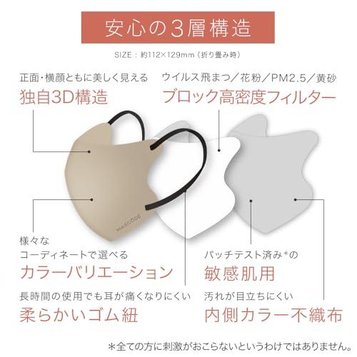 MASCODE(マスコード)は「ファッション性」と「機能性」を兼ね備え、より快適で毎日使いたくなるマスクを提案します。 豊富なカラー展開と1人1人の顔にフィットし正面・横顔ともに美しく見える独自の立体形状を採用しスタイリッシュかつ個性を引き出す「ファッション性」を実現。 花粉や黄砂、ウイルス飛まつを徹底ブロック+息がしやすい独自の立体構造+長時間の使用でも耳が痛くなりにくい平ゴムを採用し毎日使いたくなる「機能性」を実現しました。MASCODE(マスコード)は「ファッション性」と「機能性」を兼ね備え、より快適で毎日使いたくなるマスクを提案します。 豊富なカラー展開と1人1人の顔にフィットし正面・横顔ともに美しく見える独自の立体形状を採用しスタイリッシュかつ個性を引き出す「ファッション性」を実現。 花粉や黄砂、ウイルス飛まつを徹底ブロック+息がしやすい独自の立体構造+長時間の使用でも耳が痛くなりにくい平ゴムを採用し毎日使いたくなる「機能性」を実現しました。【独自の立体構造】 正面・横顔ともに美しく見える+ムレにくく、唇が内側につきにくい独自の立体構造を採用し、 形状・素材・仕様すべてにこだわりました。【内側カラー不織布採用】 大多数のマスクユーザーの悩みである「マスク内側の汚れ」。 マスク内側をカラー不織布にすることで メイクや皮脂による汚れが目立たなくなり、 外出先でマスクを外す際にも気になりません。【柔らかいゴム紐】 長時間の使用でも耳が痛くなりにくい平ゴム仕様です。【安心の3層構造】 花粉や黄砂、PM2.5などはもちろん、粒子が細かいウイルス飛沫もしっかりブロック。 JIS適合審査済み。