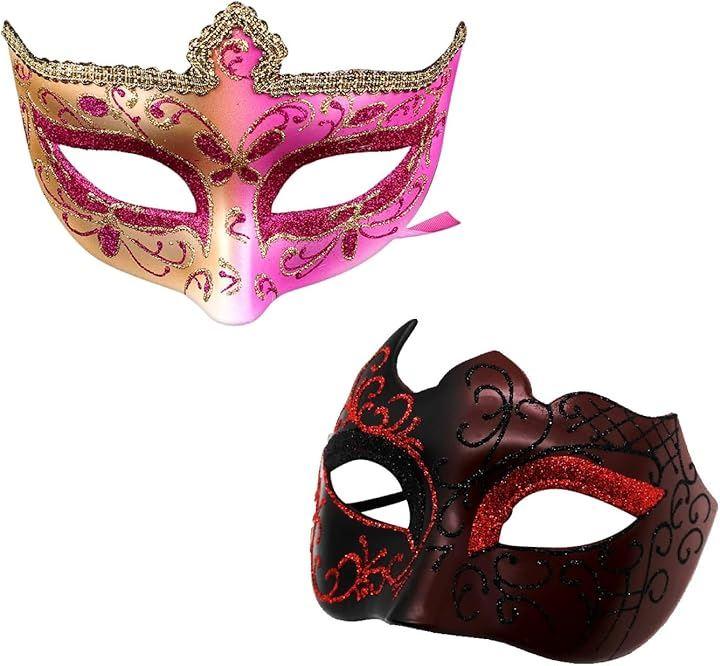 仮面 ベネチアンマスク:贅沢に施されたキラキラ輝くラメが妖艶な、男性向けのデザインと女性向けデザインのマスカレードマスクのセット。