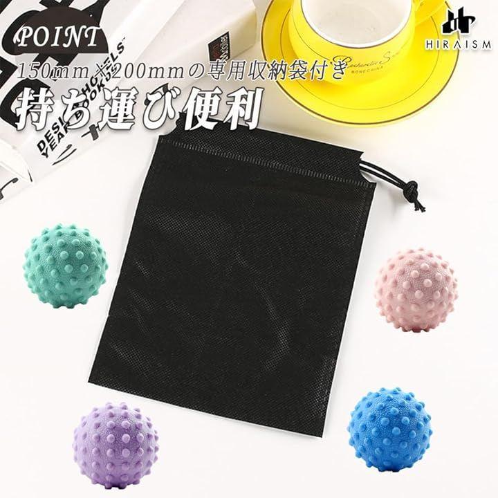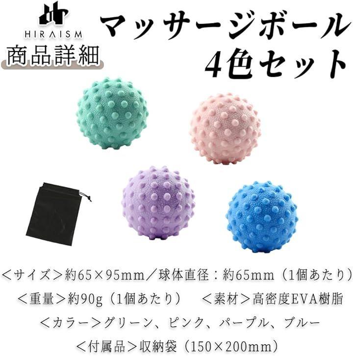 「商品内容」マッサージボール4色セット <サイズ>約65x95mm/球体直径:約65mm(1個あたり) <重量>約90g(1個あたり) <素材>高密度EVA樹脂 <カラー>グリーン、ピンク、パープル、ブルー<付属品>収納袋(150x200mm)