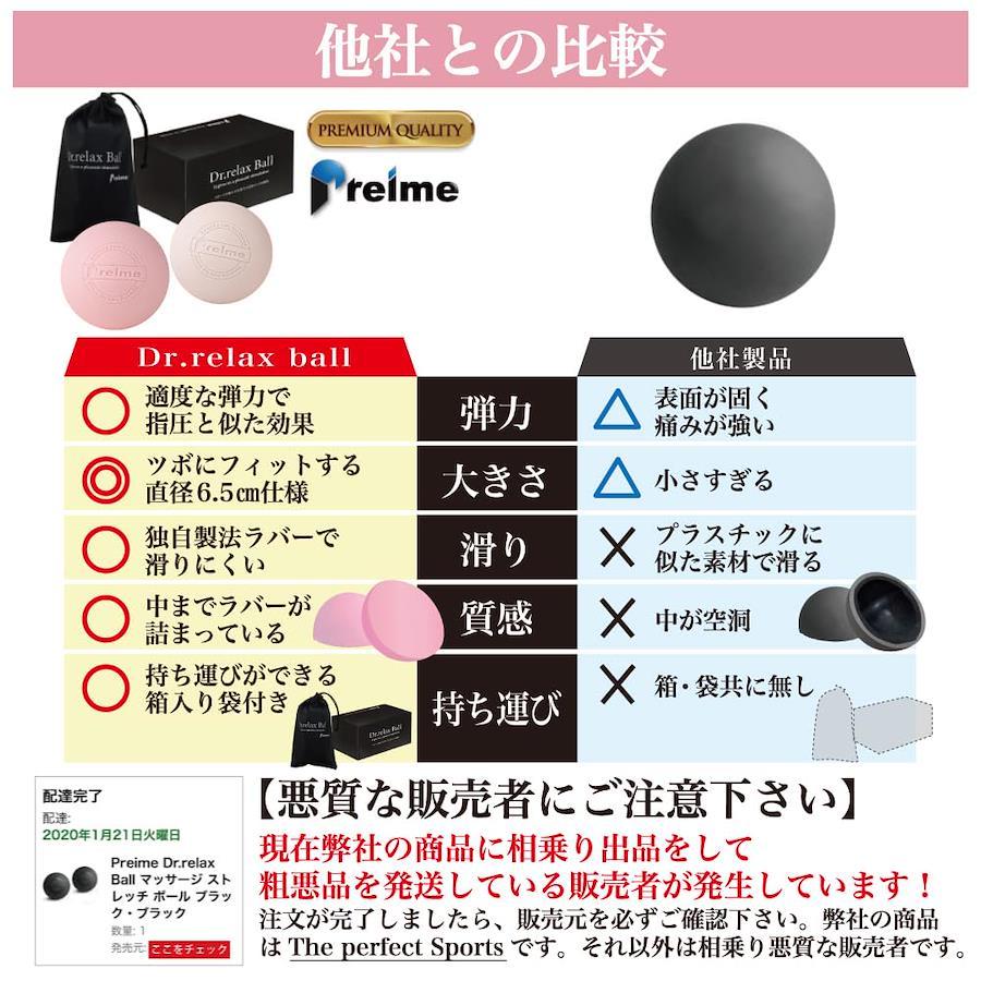【 見た目が似た商品とは 中身が違います 】The Prefect Sports (ザ パーフェクト スポーツ)は、有名ブランド比べると、知名度では「ナンバー1」ではありません。しかし「ナンバー1」のコストパフォーマンスを提供します。「アンダー5,000円 最強のパフォーマンスと自信をもってお届けできる商品だけを厳選して開発する」というコンセプトの元、世界中からこだわりを持ってセレクト・企画・開発した商品を、有名ブランドが使用する世界各国の生産ラインで製品化しています。【 スポーツ時に“プラス1“の感動をあなたに 】テレビCMに巨額の広告費を投じる、誰でも知っているトップブランド品や、販売価格が1ケタ多いトップブランド品と同等のパフォーマンスから、スポーツを行う時のプラス1の感動にあなたは驚くはずです! 【 マッサージボール 】マッサージやトレーニング後のストレッチ、エクササイズにぴったりのマッサージ・ストレッチボールです。マッサージボールを使う、主な要因は日常や仕事での体のコリをマッサージやストレッチで解消すること、またスポーツやトレーニング時の疲れを解消、筋膜リリースしてくれることではないでしょうか?マッサージ店などの指圧やストレッチによりこれらの疲れやコリは解消できます。しかし普段からマッサージ店に通い、ストレッチや筋膜リリースを行うことは時間面においても金額面においてもなかなか難しいと思います。できる限り自宅でマッサージ店での指圧効果を得る為に当社ではスポーツ工学に基づいて2つのポイントを重視したストレッチ・マッサージボールを開発しました。お客様からも高評価のレビューを頂いております。 “日頃の疲れを癒やすには充分な刺激”、“個人的には足の裏のマッサージもかなり気に入っています”、“坐骨神経痛があるのでそこに当てるとピンポイントで当たり、神経痛も改善しとても良かったです”などの高評価を頂き、レビュー平均点も4.5点以上を頂いております。 【 スポーツ専門店が本気で考えたコリ・疲れ簡単解消マッサージボール 】弊社のマッサージボール、ストレッチボールの特徴は2点です。1.指圧に似た弾力性 1口にマッサージボール、ストレッチボールと言っても色々な種類があります。 他社製品などはゴムボールの中身が空白にし経費を抑えている商品が多いです。 中身を空白にする為、表面を固くして強度を保っております。そうすると強度が保たれる代わりに弾力性が低くなってしまいます。 当社の商品は弾力性を重視し、ゴムの中身を詰めているので指圧に似た弾力性を実現しております。マッサージやトレーニング後のストレッチ、エクササイズなどの筋膜リリースに最適です。また、負荷をかけすぎることなく、マッサージやストレッチ、筋膜リリースをすることができます。2.トリガーポイントを刺激する大きさ スポーツ工学に基づきトリガーポイントを刺激する大きさにしております。その為、肩や背中のほかに、腰、太もも、ふくらはぎ、足裏など全身でのマッサージ、ストレッチ、筋膜リリースが可能です。 【 保証内容 】より多くのお客様にご利用頂けるように、商品に万が一不具合が御座いましたら、お手数ですがセラー問い合わせ先にご連絡下さい。24時間以内に日本人スタッフにより迅速に対応させて頂きます。 【 商品の仕様について 】素材:ラバー。カラー:ブラック&ブラック、オレンジ&イエロー、ブルー&ライトブルー、グリーン&ライトグリーン、ピンク&ライトピンク、パープル&ラベンダー、スモーキーピンク&ピンクベージュ、グレー&ライトグレー、アイボリー&オフホワイト。重量は150g/個 大きさは縦×横=6cm×6cm。