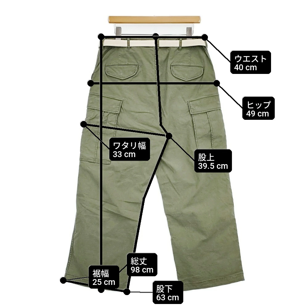 | 実寸サイズ | 総丈:約98cm ウエスト:約40cm 股上:約39.5cm 股下:約63cm ヒップ:約49cm ワタリ幅:約33cm 裾幅:約25cm ※採寸画像がある商品はハンガーに吊るした状態での計測のため、平置きでの採寸とは差が生じる場合がございます。平置きでの実寸サイズをご希望の場合は、ご購入前に必ずご質問ください。 ※記載以外のサイズが合わないことを理由とした返品はできませんので、 記載部分以外で実寸サイズの気になる箇所があれば必ず購入前にご質問ください。 |