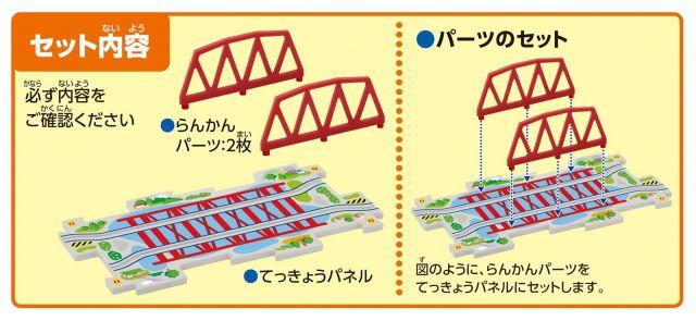 商品紹介パネルワールドの世界が楽しく広がる、鉄橋付き拡張パネル。鉄橋をわたってどんどん新幹線が走るよ!セット内容鉄橋パネル1枚安全警告なし