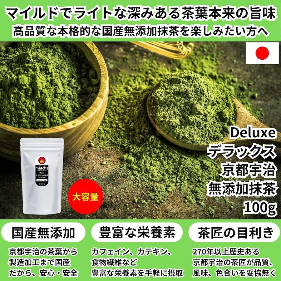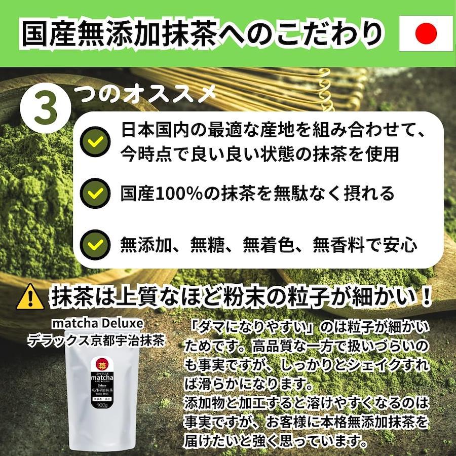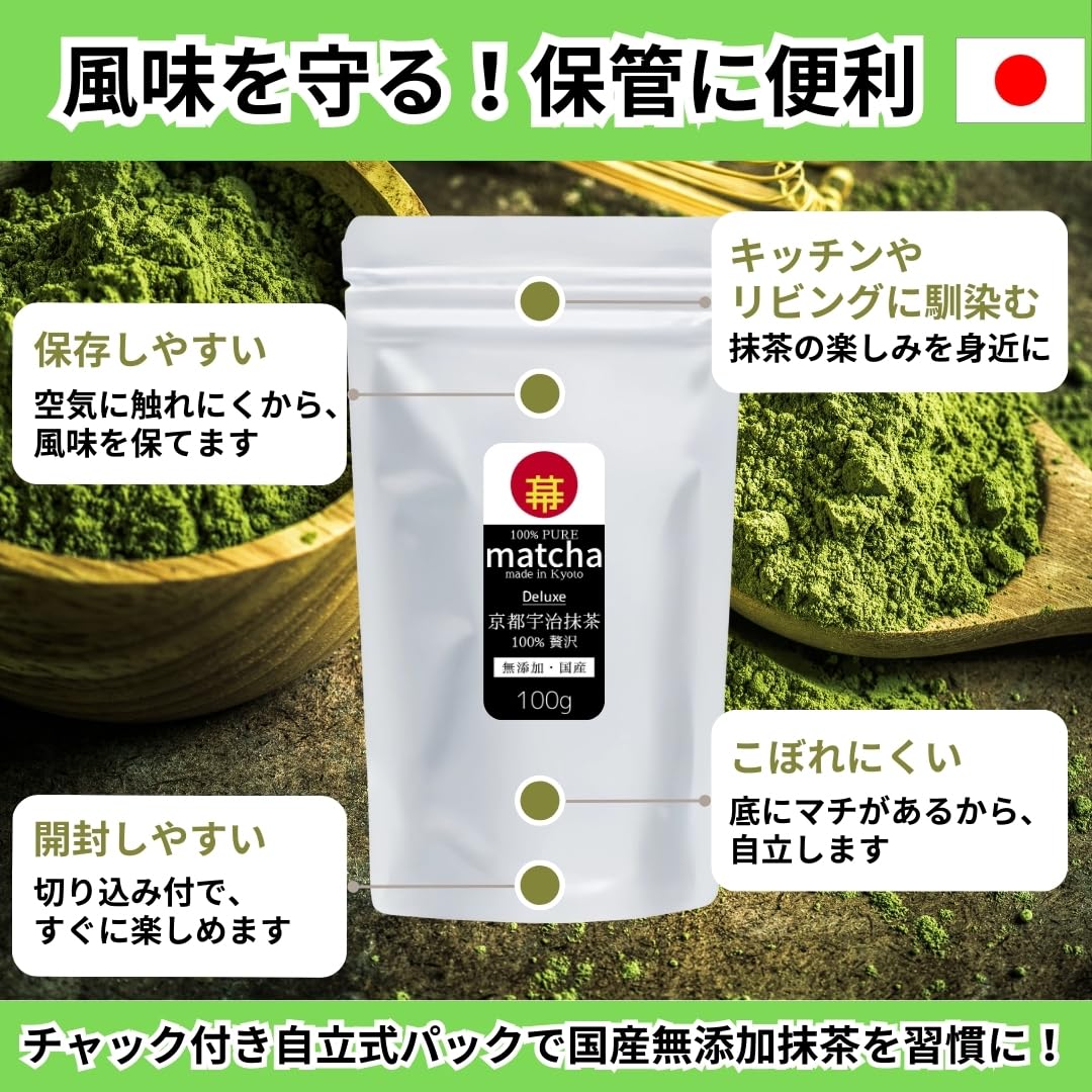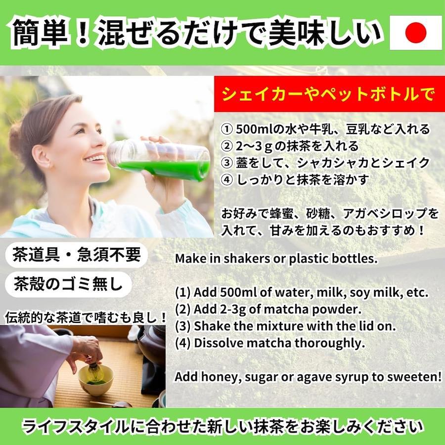 無添加抹茶:100%国産(京都宇治)。本物を求めるあなたへ。京都宇治産の茶葉を100%使用した、国産・無添加の抹茶です。自然の恵みがたっぷり詰まった、混じりけのないピュアな味。着色料や保存料は一切使用せず、抹茶本来の豊かな香りと深い味わいをそのままお届けします。一口飲めば、豊かな香りと深い味わいが口いっぱいに広がり、心と体が喜ぶ一杯をお楽しみください。?抹茶をお楽しみいただけるように高品質の茶葉を使用。鮮やかな緑が特徴。色、味、香りのすべてを心ゆくまで抹茶を楽しんでいただきたいです。質の高い抹茶をお届けするために、こだわり抜いた茶葉を使用しています。?爽やかな抹茶の香り渋味を抑えた贅沢な風味。開けた瞬間から自然な抹茶の香りがふわりと広がります。その芳醇な香りとまろやかな旨みが口いっぱいに広がり、心まで満たされるような至福のひとときを。豊かな味わいをご堪能ください。?創業1751年江戸時代より続く伝統ある京都宇治茶の製茶卸問屋と協力し、製造。宇治茶は静岡・狭山と並ぶ「日本三大茶」の一つ。始まりは鎌倉時代。江戸時代には「宇治製法」の発明・普及による庶民の茶へと茶匠たちのたゆまぬ研鑽と努力により、宇治茶は全国に広く知られていきました。昼夜の温度差により霧が発生しやすく降水量にも恵まれた良質な茶の産地・宇治。本物の香りと味わいを生み出します。 お茶の聖地、京都宇治ならではの、気品あふれる贅沢な一杯をあなたの日常にお届けします。?抹茶は飲むスーパーフード!海外で「スーパーフード」として注目されている話題の抹茶。その秘密は、茶葉をそのまま丸ごと粉末にしているから。お茶として飲むよりも、茶葉が持つ豊富な栄養素を余すことなく摂取できます。食物繊維やカテキン、ビタミンまで、茶葉本来の恵みを丸ごとカラダに取り入れられるのです。毎日の一杯が、あなたの健康に。?飲み方:5秒シェイクするだけで本格抹茶になります。とても簡単なので忙しい方でも続けやすいです。毎日の抹茶習慣を心身ともに“ととのう“リラックスする瞬間にしてください?コーヒーが苦手でも大丈夫。やさしい一杯をどうぞ。コーヒーに代わる、自然な飲み物をお探しですか?そんなあなたにこそ、カフェインを気にせず楽しめる、心と体にやさしい一杯をおすすめします。午後のひととき、頑張りたいけど高ぶりたくない時にもぴったり。コーヒーとは違う、穏やかな心地よさが、あなたをそっと包み込みます。新しい習慣で、毎日をより豊かにしてみませんか。?穏やかに、集中力を高める!コーヒーは好きだけど、カフェインが気になる。そんな方におすすめなのが抹茶です。抹茶に含まれる「テアニン」は、気持ちを穏やかに整え、集中力を高める効果が期待できます。コーヒーのような急激な高ぶりがないため、仕事や勉強の合間に飲むことで、穏やかながらも持続的なパフォーマンスをサポートします。?アレンジ無限大!いつものドリンクや食事を格上げ。牛乳、豆乳、オーツミルクなど、お好きな飲み物と混ぜるだけでおいしくお召し上がりいただけます。いつものシリアルやグラノーラにプラスすれば抹茶風味で味変。バニラアイスのトッピングにもぴったりです。さらに、おすすめは砂糖と合わせて、バタートーストにひとふり! おいしさをぐっと引き立ててくれます。?軽量&コンパクト:酸味を感じにくいように品質保持のため、チャック付きのアルミ袋を使用。環境への負荷軽減【免責事項】メーカーによる商品リニューアルに伴いパッケージ(内容量も含む)変更が行われた場合、新パッケージでお届け致します事ご了承願います。