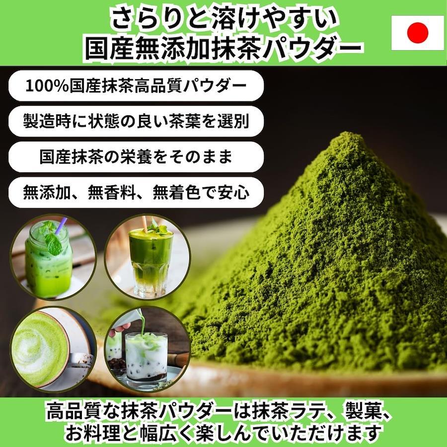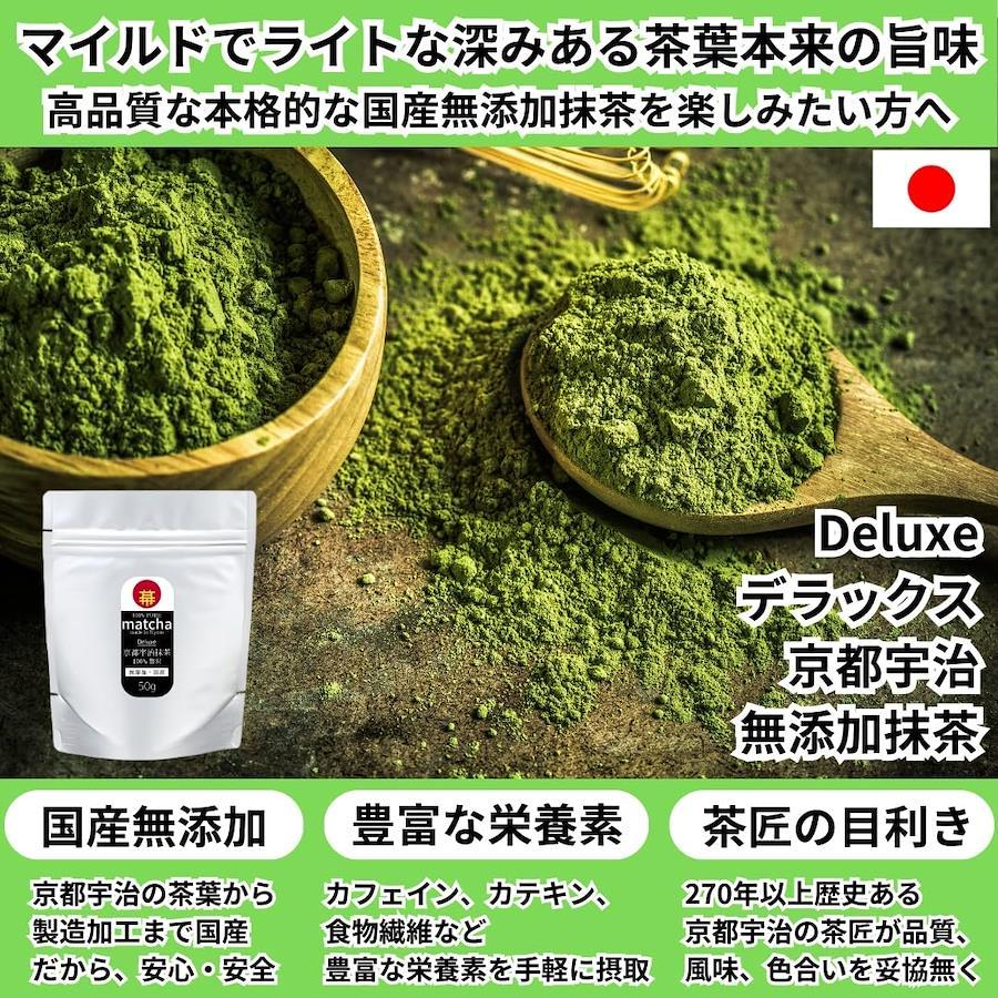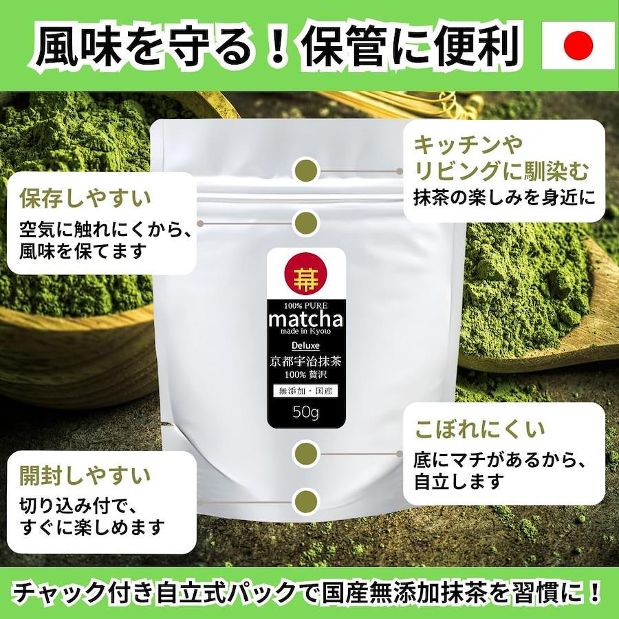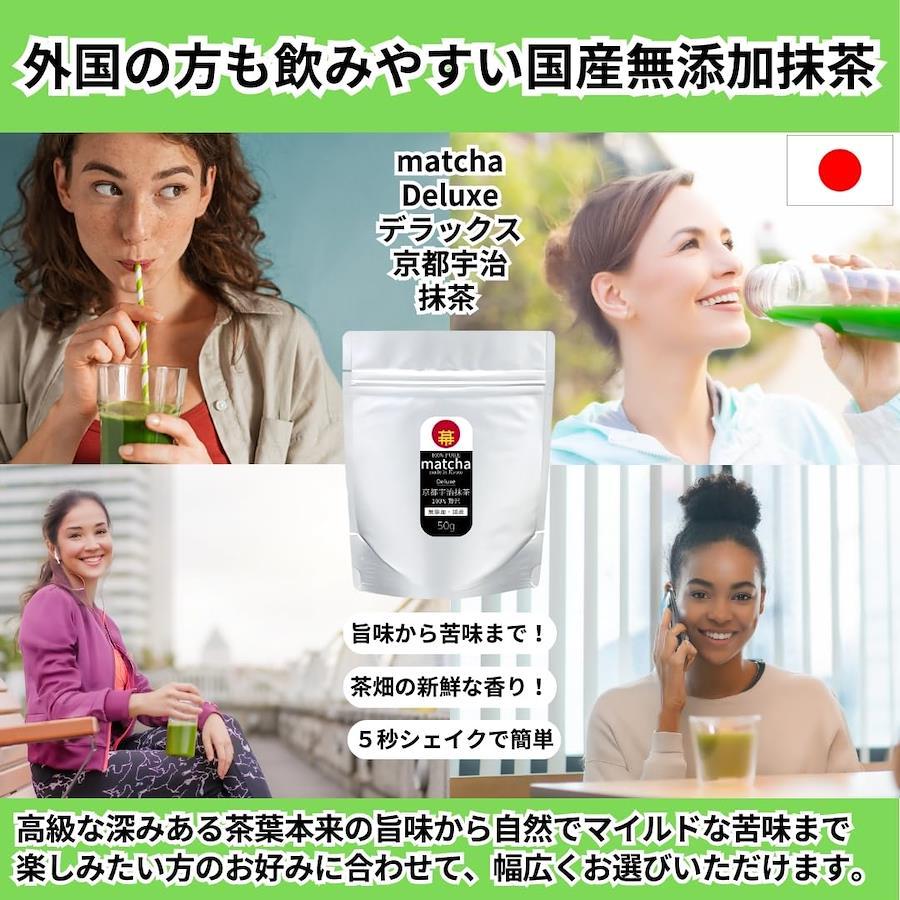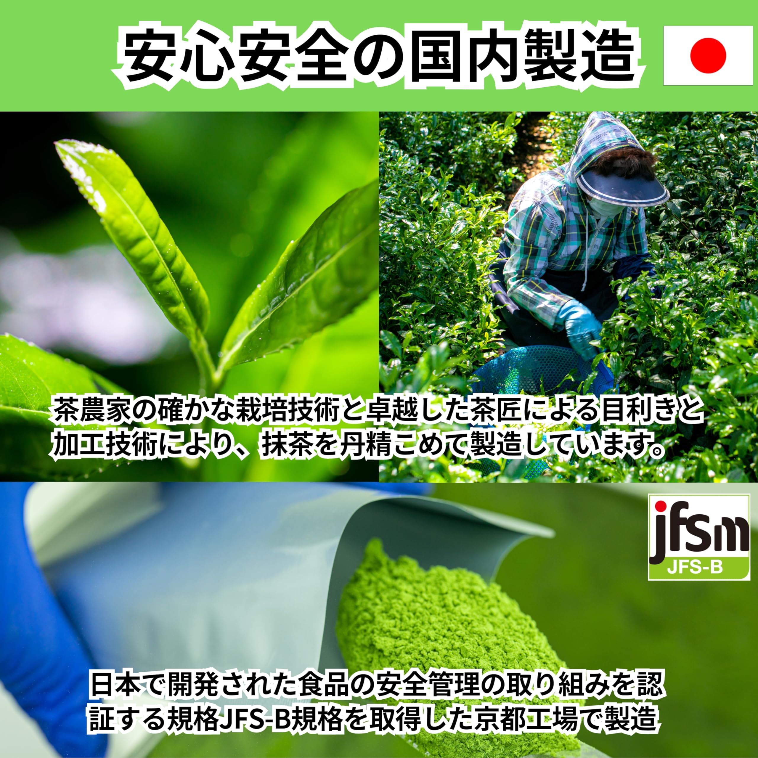 無添加抹茶:100%国産(京都宇治)?品質:抹茶をお楽しみいただけるように高品質の茶葉を使用?風味:爽やかな抹茶の香り渋味を抑えた贅沢な風味が特徴です。開けた瞬間から自然な抹茶の香りが広がります?製造:創業1751年江戸時代より続く伝統ある京都宇治茶の製茶卸問屋と協力し、製造?豊富な栄養素:茶葉をそのまま粉末にしているため、茶葉本来の栄養素を丸ごと摂取することができます。海外ではスーパーフードと話題?飲み方:5秒シェイクするだけで本格抹茶になります。とても簡単なので忙しい方でも続けやすいです。毎日の抹茶習慣を心身ともに“ととのう“リラックスする瞬間にしてください?カフェイン:コーヒーに代わる自然な飲み物をお探しの方やコーヒーが苦手な方におすすめ?軽量&コンパクト:酸味を感じにくいように品質保持のため、チャック付きのアルミ袋を使用。環境への負荷軽減【免責事項】メーカーによる商品リニューアルに伴いパッケージ(内容量も含む)変更が行われた場合、新パッケージでお届け致します事ご了承願います。