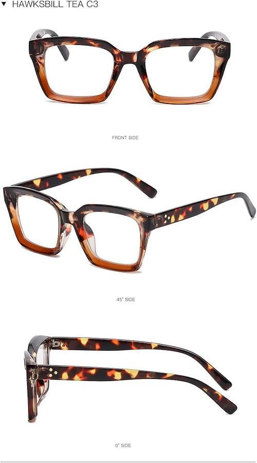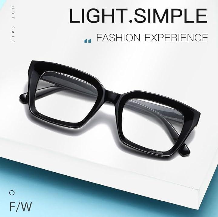 デザイン性: 太縁のスクエアフレームが特徴的なオーバーサイズメガネ。