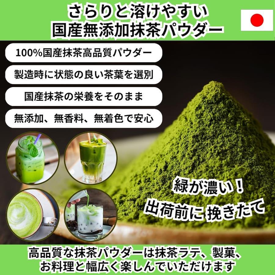 無添加抹茶:100%国産(京都宇治)。本物を求めるあなたへ。京都宇治産の茶葉を100%使用した、国産・無添加の抹茶です。自然の恵みがたっぷり詰まった、混じりけのないピュアな味。着色料や保存料は一切使用せず、抹茶本来の豊かな香りと深い味わいをそのままお届けします。一口飲めば、豊かな香りと深い味わいが口いっぱいに広がり、心と体が喜ぶ一杯をお楽しみください。?抹茶をお楽しみいただけるように高品質の茶葉を使用。鮮やかな濃い緑が特徴。色、味、香りのすべてを心ゆくまで抹茶を楽しんでいただきたいです。質の高い抹茶をお届けするために、こだわり抜いた茶葉を使用しています。?爽やかな抹茶の香り渋味を抑えた贅沢な風味。開けた瞬間から自然な抹茶の香りがふわりと広がります。その芳醇な香りとまろやかな旨みが口いっぱいに広がり、心まで満たされるような至福のひとときを。豊かな味わいをご堪能ください。?茶産業が盛んな「茶源郷」京都宇治和束町の製茶卸問屋と協力し、製造。宇治茶は静岡・狭山と並ぶ「日本三大茶」の一つ。始まりは鎌倉時代。江戸時代には「宇治製法」の発明・普及による庶民の茶へと茶匠たちのたゆまぬ研鑽と努力により、宇治茶は全国に広く知られていきました。昼夜の温度差により霧が発生しやすく降水量にも恵まれた良質な茶の産地・宇治。本物の香りと味わいを生み出します。 お茶の聖地、京都宇治ならではの、気品あふれる贅沢な一杯をあなたの日常にお届けします。?抹茶は飲むスーパーフード!海外で「スーパーフード」として注目されている話題の抹茶。その秘密は、茶葉をそのまま丸ごと粉末にしているから。お茶として飲むよりも、茶葉が持つ豊富な栄養素を余すことなく摂取できます。食物繊維やカテキン、ビタミンまで、茶葉本来の恵みを丸ごとカラダに取り入れられるのです。毎日の一杯が、あなたの健康に。?飲み方:5秒シェイクするだけで本格抹茶になります。とても簡単なので忙しい方でも続けやすいです。毎日の抹茶習慣を心身ともに“ととのう“リラックスする瞬間にしてください?コーヒーが苦手でも大丈夫。やさしい一杯をどうぞ。コーヒーに代わる、自然な飲み物をお探しですか?そんなあなたにこそ、カフェインを気にせず楽しめる、心と体にやさしい一杯をおすすめします。午後のひととき、頑張りたいけど高ぶりたくない時にもぴったり。コーヒーとは違う、穏やかな心地よさが、あなたをそっと包み込みます。新しい習慣で、毎日をより豊かにしてみませんか。?穏やかに、集中力を高める!コーヒーは好きだけど、カフェインが気になる。そんな方におすすめなのが抹茶です。抹茶に含まれる「テアニン」は、気持ちを穏やかに整え、集中力を高める効果が期待できます。コーヒーのような急激な高ぶりがないため、仕事や勉強の合間に飲むことで、穏やかながらも持続的なパフォーマンスをサポートします。?アレンジ無限大!いつものドリンクや食事を格上げ。牛乳、豆乳、オーツミルクなど、お好きな飲み物と混ぜるだけでおいしくお召し上がりいただけます。いつものシリアルやグラノーラにプラスすれば抹茶風味で味変。バニラアイスのトッピングにもぴったりです。さらに、おすすめは砂糖と合わせて、バタートーストにひとふり! おいしさをぐっと引き立ててくれます。?軽量&コンパクト:酸味を感じにくいように品質保持のため、チャック付きのアルミ袋を使用。環境への負荷軽減【免責事項】メーカーによる商品リニューアルに伴いパッケージ(内容量も含む)変更が行われた場合、新パッケージでお届け致します事ご了承願います。