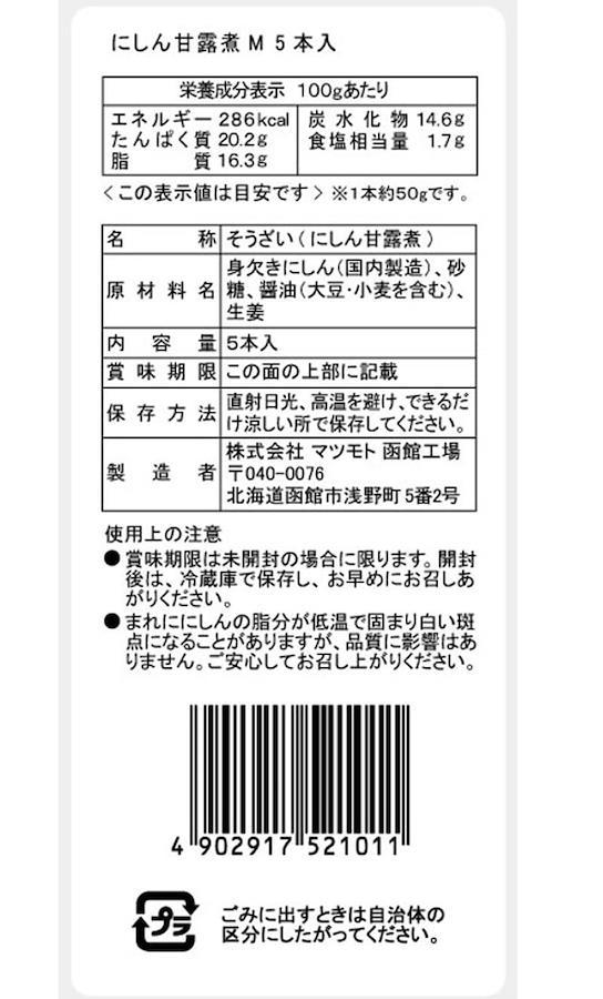 身欠きにしん(国内製造)、砂糖、醤油(大豆・小麦を含む)、生姜