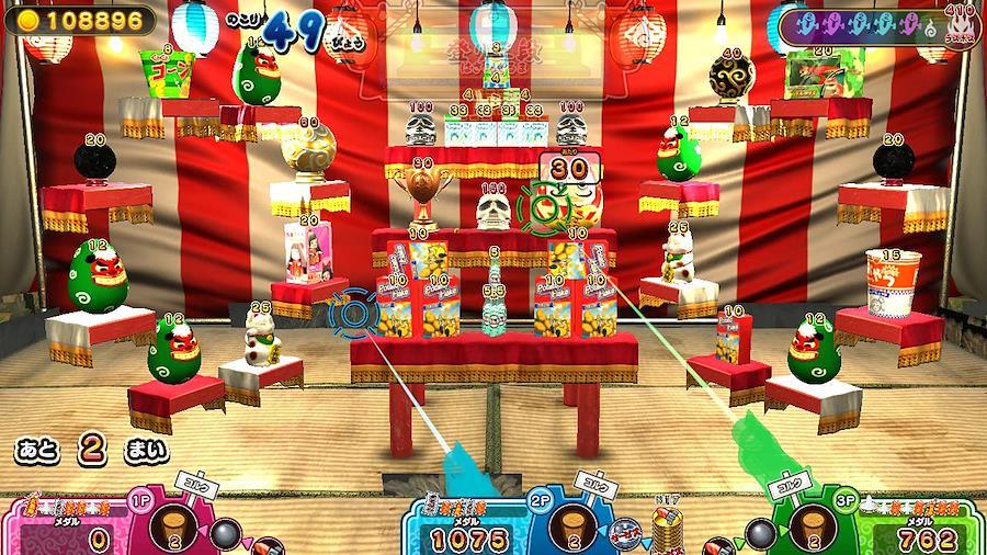 メダルモードの射的屋ステージでは、正面に並べられている景品(的)をじっくり狙って撃ち、景品が落とせると、景品に書かれた数字分のメダルがもらえます。