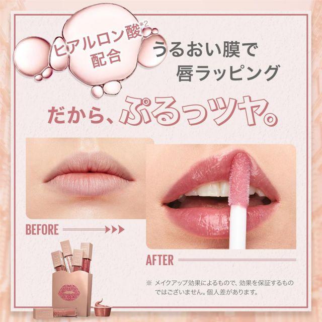 ヒアルロン酸*配合うるおい膜で唇ラッピングだから、ぷるっツヤ。MAX!ヒアルロン酸配合のこっくりテクスチャがむっちり密着4時間続くうるおいとツヤで、唇をぷるっと見せる
