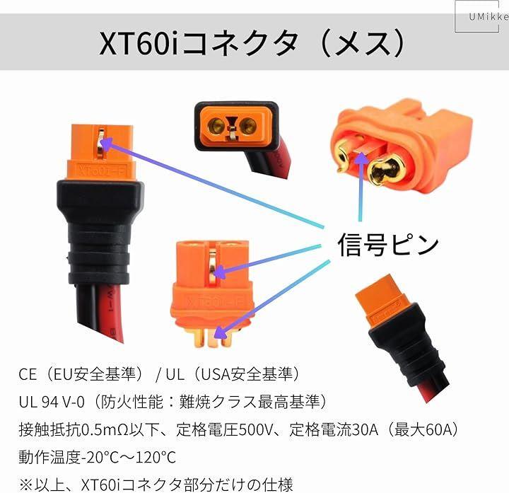 MC4コネクタ(オスメス)とXT60iコネクタ(メス)取付済み、太さ10AWGのソーラーケーブル、XT60iはXT60にも対応「MC4コネクタでソーラーパネルシステムに接続し、XT60iコネクタを持つバッテリーやチャージャーへ接続」「ケーブル」10AWG、銅線断面積5.26mm2、メッキ銅線、股数105、電気抵抗2.36Ω/km、ケーブル外直径は赤黒とも5mm、AWM UL2468、PVC被膜、FTI適合、RoHS準拠「MC4コネクタ(オス・メス)」TUV認証・IP68「XT60iコネクタ(メス)」CE/UL、接触抵抗0.5mΩ以下、動作温度-20℃~120℃「総合・共通」防水性能IP67以上(MC4コネクタ部分はIP68)、定格電流20.5A(最大23.7A)、耐電圧300V、動作温度-20℃~80℃、防火性能UL94V-0