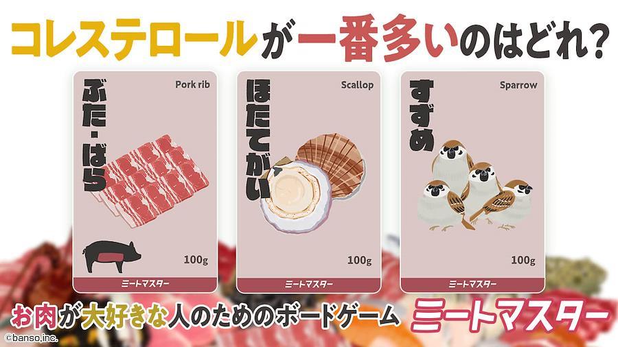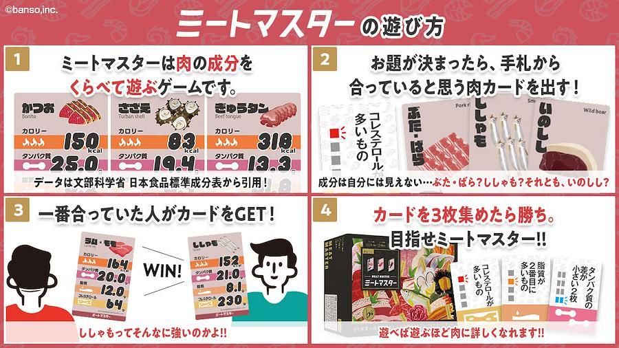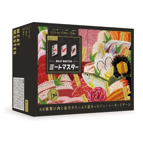 3営業日以内に発送≪新品未開封品≫『ミートマスター』はお肉が大好きな人のためのボードゲームです。ルールはとてもシンプルで、もっともお題に合う成分をもった肉カードを手札から出していくだけ。ただしスタンドに立てた自分の手札の肉たちは名前しか見えないので、注意が必要です。お題に合うカードを出せた人がお題カードを受け取り、3枚集めたら勝者になります。1人で遊べるルールも収録しており、人数を選ばず遊ぶことも可能です。 カードは全部で60種類。牛・豚・鶏をはじめとした代表的な肉類や意外な栄養をもつジビエ、魚介類など広い意味での肉たちが描かれており、眺めるだけでも楽しめます。成分データは文部科学省が発表した日本食品標準成分表2020年版(八訂)から引用している本格派。