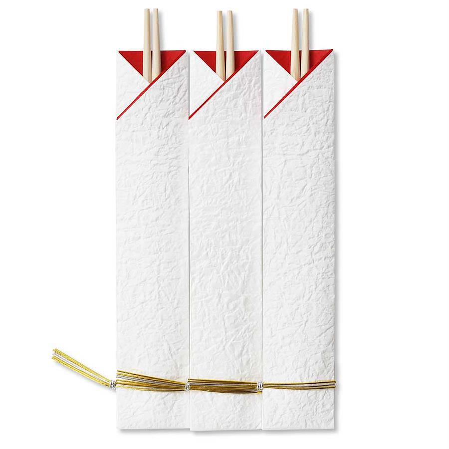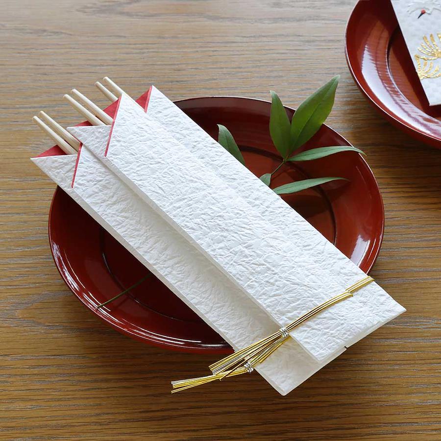 揉み紙の箸包みに、金銀の水引を結んだシンプルで品のある祝箸。