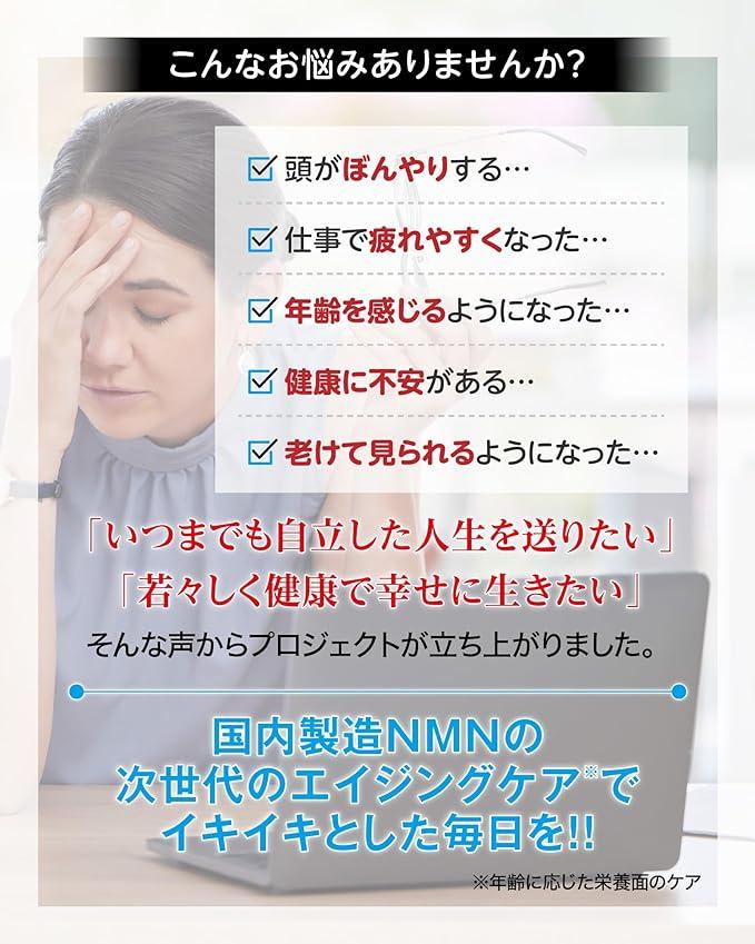 この商品について 人生100年時代、いつまでもスッキリエビデンスを元に開発された次世代成分NMN100%サプリです。 1日2粒でビジネス脳力や健康・美容が気になる方をケアします。 長年の研究・エビデンスを元に開発。1粒に純度99%以上のNMN200mg配合 品質や安全性に徹底してこだわり、高い技術を持つ国内GMP認定工場で製造。 医薬品レベルのPTP個別包装を採用。飲む直前まで高い品質を保持します。
