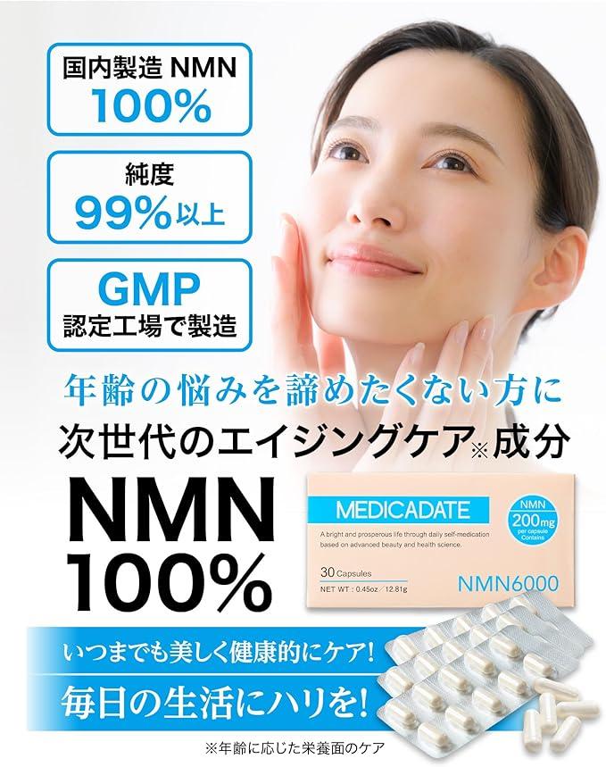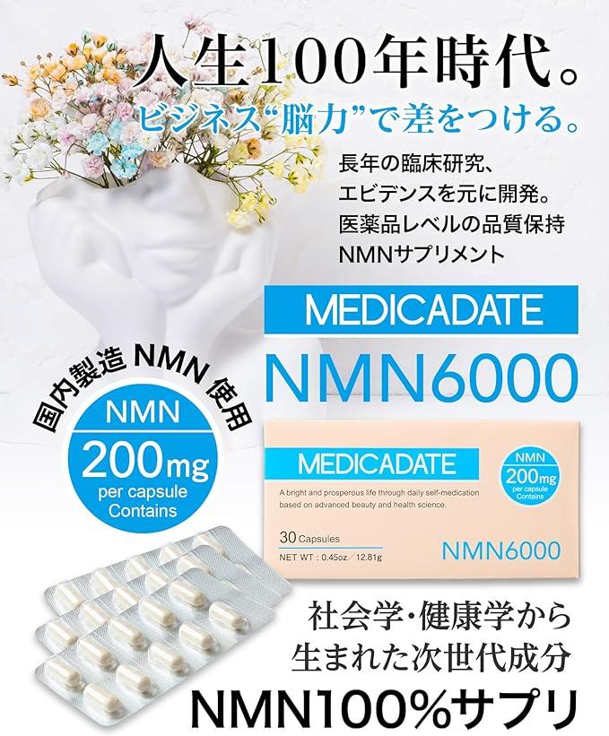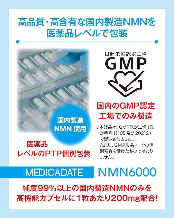 【MEDICADATE メディカデイト】高配合NMN サプリメント 6000mg(1粒に200㎎)日本製 高純度99%以上 PTP個別包装30日分 国内GMP認定工場生産