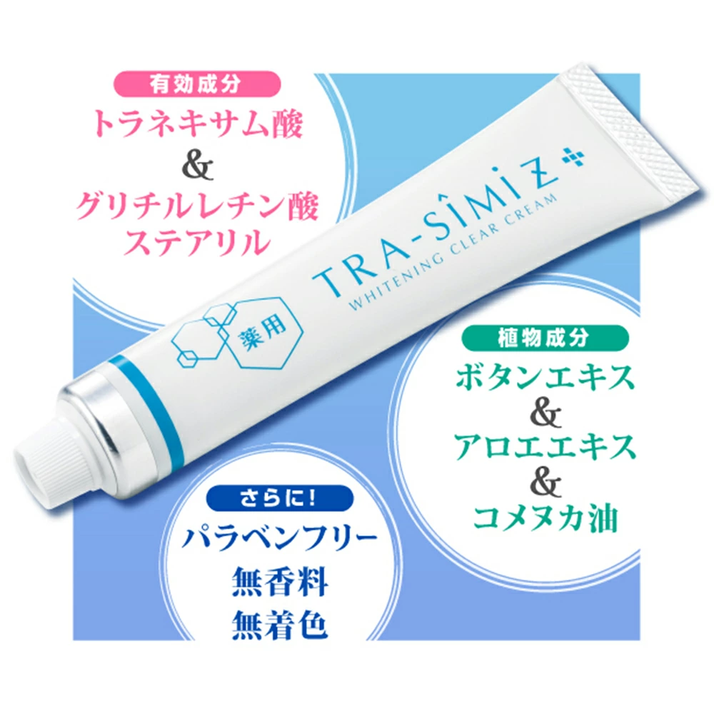 【商品名(JAN)】薬用 トラシーミZ 30g【医薬部外品】(4560164887542)【商品サイズ(約)】縦2×横12.9×高さ3.5cm【容量】約30g【素材 / 成分】<有効成分>トラネキサム酸、グリチルレチン酸ステアリル<その他の成分>精製水、濃グリセリン、1,3ブチレングリコール、カルボキシビニルポリマー、1,2-ペンタンジオール、コメヌカ油、ベヘニルアルコール、アラキルグルコシド・アラキルアルコール・ベヘニルアルコール、セトステアリルグルコシド・セトステアリルアルコール、ポリアクリル酸アミド、トリ(カプリル・カプリン酸)グリセリル、軽質流動イソパラフィン、メチルポリシロキサン、ユキノシタエキス、カッコンエキス、ボタンエキス、アロエエキス(2)、クロレラエキス、ポリオキシエチレンラウリルエーテル、天然ビタミンE、フェノキシエタノール【製造国】日本【商品情報】ピンポイントでシミをケア!トラネキサム酸 高濃度2.0%配合のクリーム美白成分トラネキサム酸を高濃度2.0%配合のクリーム。有効成分「トラネキサム酸」がシミの元となるメラニンの生成を抑えます。ボタンエキス、アロエエキス、コメヌカ油など、美白成分、エイジングケア成分、保湿成分も贅沢配合。あなたを悩ませるシミやソバカスにやさしく働きかけ、ハリ・弾力を与えながら透明感あふれる、輝きに満ちた白く美しい肌に導きます。