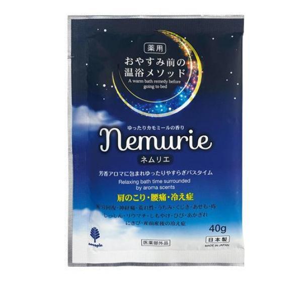 製品の特徴●粉末タイプの薬用入浴剤「おやすみネムリエ」●ゆったり カモミールの香り。やさしく温かみのある香りでリラックス。●おやすみ前の温浴メソッド。●温浴効果を高めて血行を促進。疲労回復、腰痛、肩のこり、冷え症のつらい症状をやわらげます。●温浴効果により、荒れ性、しっしん、あせも等の症状をやわらげます。●4種類の保湿成分を配合。(ローズマリーエキス、カモミラエキス、メリッサエキス、ラベンダーエキス)●保温・保湿効果に優れ、カラダの芯までしっかり温めます。●1回分40g個包装。●医薬部外品