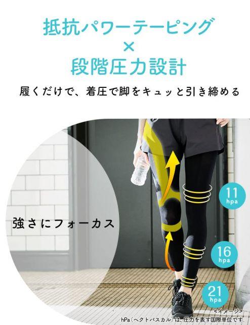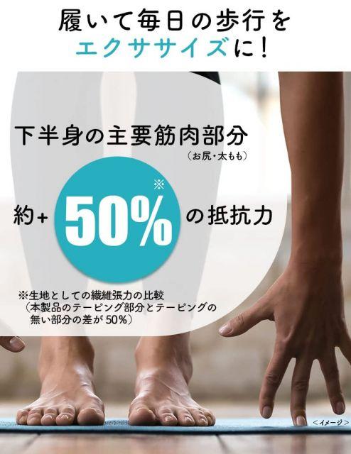 ●日常生活ではくだけで、水中ウォーキングのような加圧効果に。●抵抗テーピング技術で、水中を歩くときのような、筋肉の動きに合ったほどよい抵抗力を与えます。●抗菌防臭加工。
