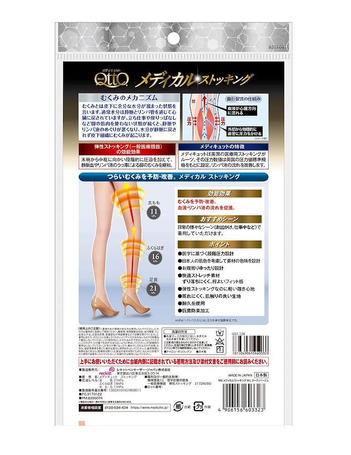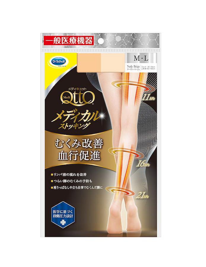 つらい脚のむくみを予防・改善、血液やリンパ液の流れを促進するメディカルストッキング 販売名:メディキュット ストッキング 製造販売届出番号:13B2X10167000011 原産国:日本 サイズ:M-L *サイズ詳細はサイズガイドをご確認ください 素材:ナイロン・ポリウレタン メディキュットはドクターショール発、英国の医療用ストッキングをルーツに持つ着圧ソックス・着圧タイツ・弾性ストッキングのリーディングブランドです。 医学に基づく段階圧力設計。はくだけで脚をキュッとひきしめます。