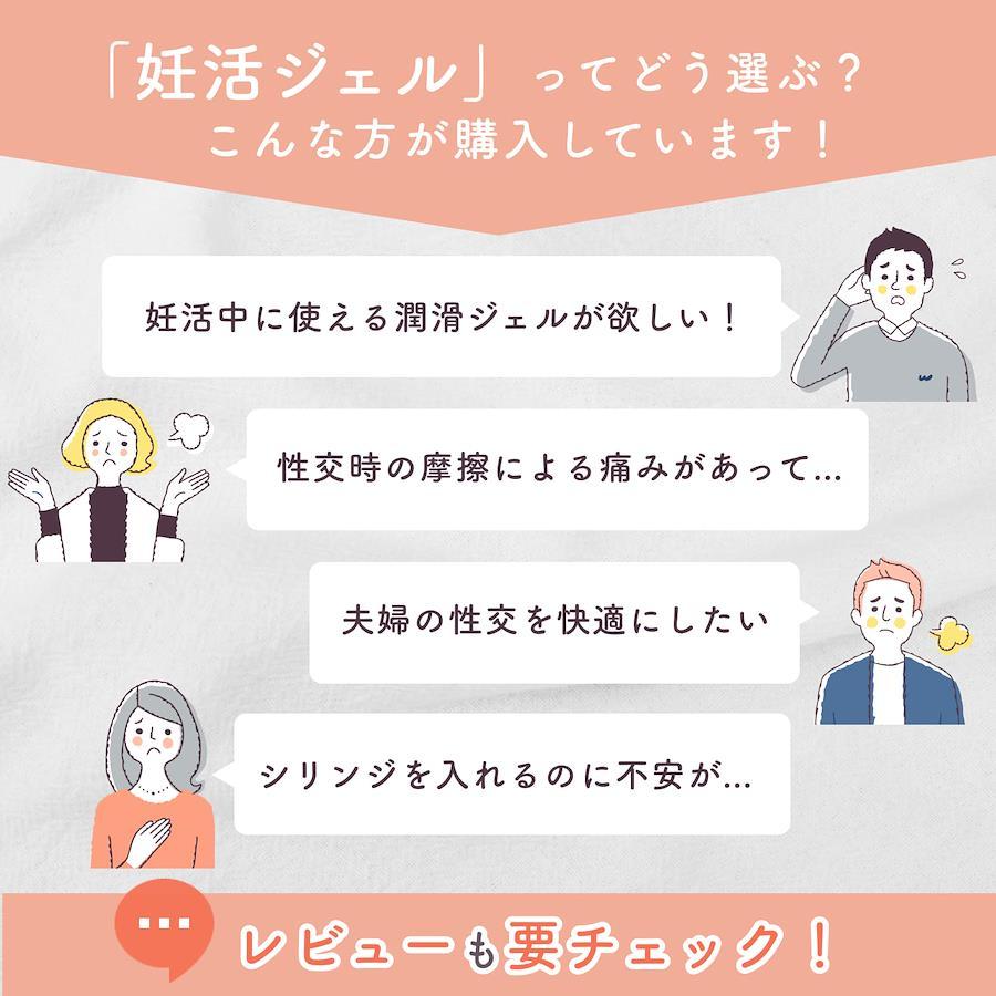 精子の活動を妨げない水溶性 :一般的な潤滑ジェルと違い、精子の活動を妨げない粘度に調整された水溶性ジェルです。 精子に適したph値 :腟内での精子の生存に適した弱アルカリ性のpH値を保ちます。 善玉菌の活動をサポート :乳酸菌発酵乳エキスが配合され、女性の健康を守る善玉菌の活動をサポートします。 うるおい成分配合 :ヒアルロン酸とコラーゲンが配合され、肌に潤いを与えます。 肌に優しいノンアルコール :肌への刺激を抑えたノンアルコール製品で、デリケートな部分にも安心してお使いいただけます。 【使用上の注意】ご使用前には必ずお届けの商品ラベルや注意書きをご確認ください。アレルギー体質の方や妊婦の方などは、かかりつけの医師にご相談のうえご購入ください。開封後はなるべくお早めにご使用ください。