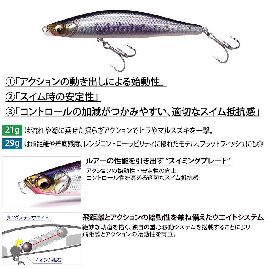 ゲンマ110Sは、ランカーハンター 久保田剛之プロデュースによる、秘蔵のシンペン。 最大の特徴は、頭部前面に縦方向に設けたスイミングプレートです。これにより、1「アクションの動き出しによる始動性」2「スイム時の安定性」3「コントロールの加減がつかみやすい適切なスイム抵抗感」を実現。 さらに、ロングディスタンス・キャスタビリティを最大限に引き出す独自の重心移動を搭載し、様々な対象魚や状況変化にアジャストすべく、ウエイトの異なる2タイプを用意しました。 ■21g…流れや潮に乗せた揺らぎアクションでヒラやマルスズキを一撃。 ■29g…飛距離や着底感度、レンジコントローラビリティに優れ、フラットフィッシュにも威力を発揮。 スキルや対象魚を問わず、様々なシチュエーションで自信を持って使えるシステマティック・シンキングペンシル、ゲンマの卓越した性能による釣果をお楽しみ下さい。