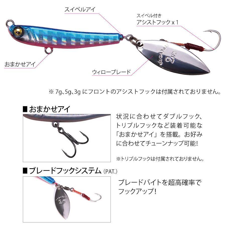 マキッパはその名の通り、投げて巻くだけの新感覚キャスティング・ブレードジグ。ソルトウォーターシーンにおいて、キャスティングジグは飛距離性能と多様な魚種に有効なことから定番のルアーとなっていますが、思い描いたアクションを出すのが難しかったり、狙ったレンジをキープしづらかったりと、使うには慣れや経験が必要なルアーといえます。マキッパは、キャスティングジグの使いにくさをカバーし、誰もが簡単に扱えるよう、徹底チューンを施しました。テールには巻くだけで集魚効果の高いブレードを装着し、さらにブレードの回転を阻害せずにブレードバイトを高確率でフックアップ可能な、ブレードフックシステム(PAT.)を搭載。計算されたボディバランスと各パーツの配置により、ボディが回転することなく安定したスイミング&フラッシングでターゲットを誘います。 使い方は着水後、即リーリングすれば表層を、沈めてからリーリングすれば中層やボトム付近をレンジキープするため、ターゲットの泳層に合わせた攻略ができます。 あらゆる魚種に効果的なティンセル付きアシストフックを標準装備しており、また腹部に設けたおまかせアイにより、好みに合わせてダ