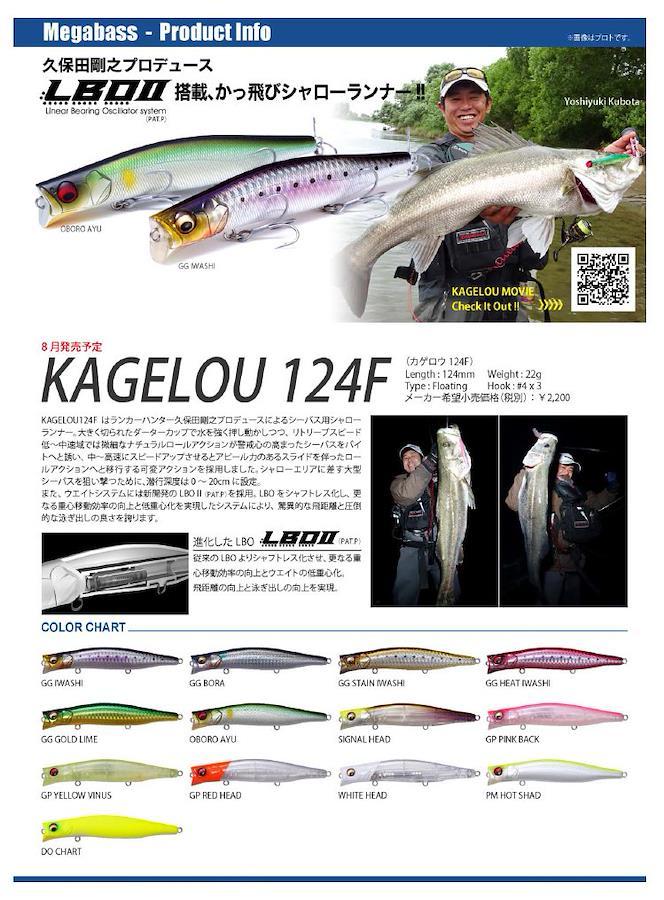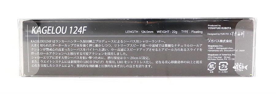 KAGELOU124Fはランカーハンター久保田剛之プロデュースによるシーバス用シャローランナー。大きく切られたダーターカップで水を強く押し動かしつつ、リトリーブスピード低~中速域では微細なナチュラルロールアクションが警戒心の高まったシーバスをバイトへと誘い、中~高速にスピードアップさせるとアピール力のあるスライドを伴ったロールアクションへと移行する可変アクションを採用しました。シャローエリアに差す大型シーバスを狙い撃つために、潜行深度は0~20cmに設定。また、ウエイトシステムには新開発のLBOII(PAT.P)を採用。 LBOをシャフトレス化し、更なる重心移動効率の向上と低重心化を実現したシステムにより、驚異的な飛距離と圧倒的な泳ぎ出しの良さを誇ります。