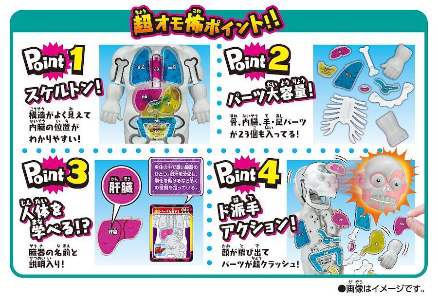 パーツを入れていき、失敗したら人体模型が暴れ出す!!【あそびかた】1, 順番にカードを引きます。2, 引いたカードに従い、そ~っとパーツを入れます。3, 失敗すると... 人体模型が暴れ出してパーツがガッシャ~ン!!したら負け!!【セット内容】・本体・顔・手足左右1対ずつ・骨パーツ7個・内臓パーツ(・脳・心臓・右肺・左肺・膵臓胆嚢・肝臓・胃・大腸・小腸・膀胱・脾臓)・カード・取扱説明書