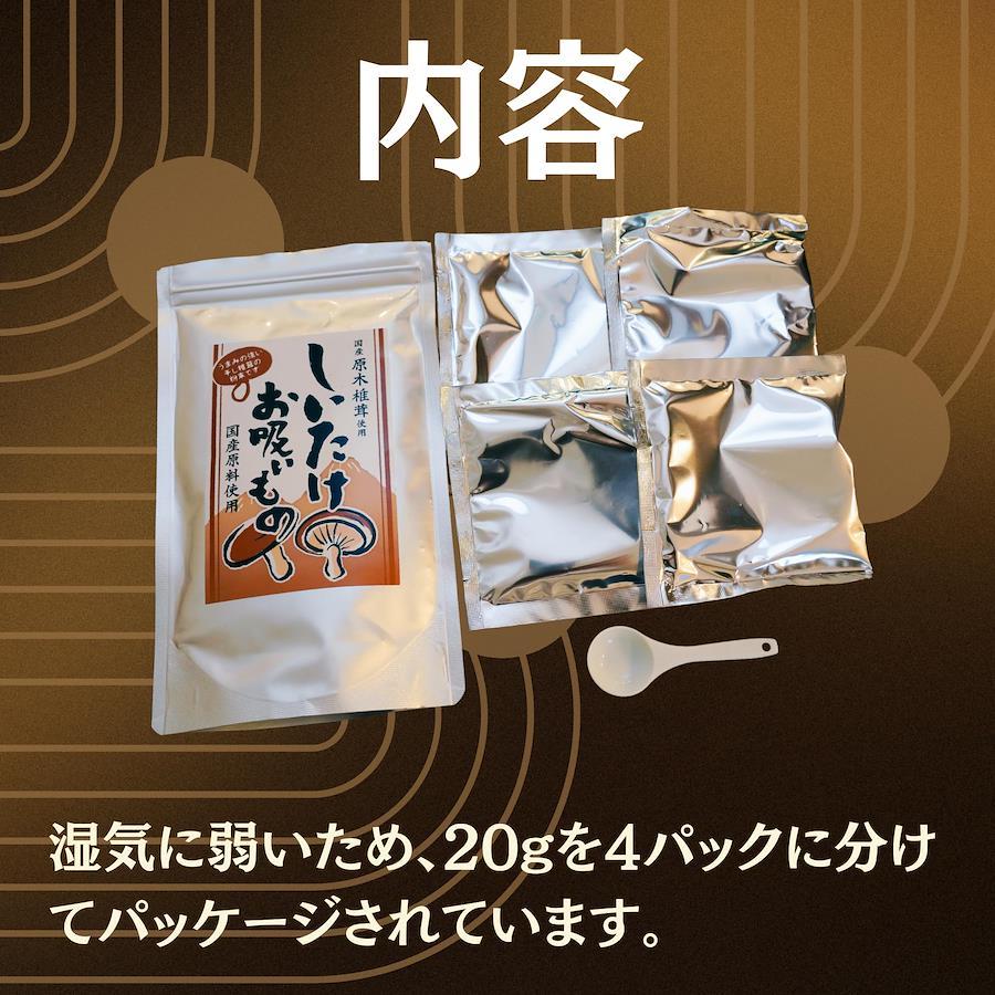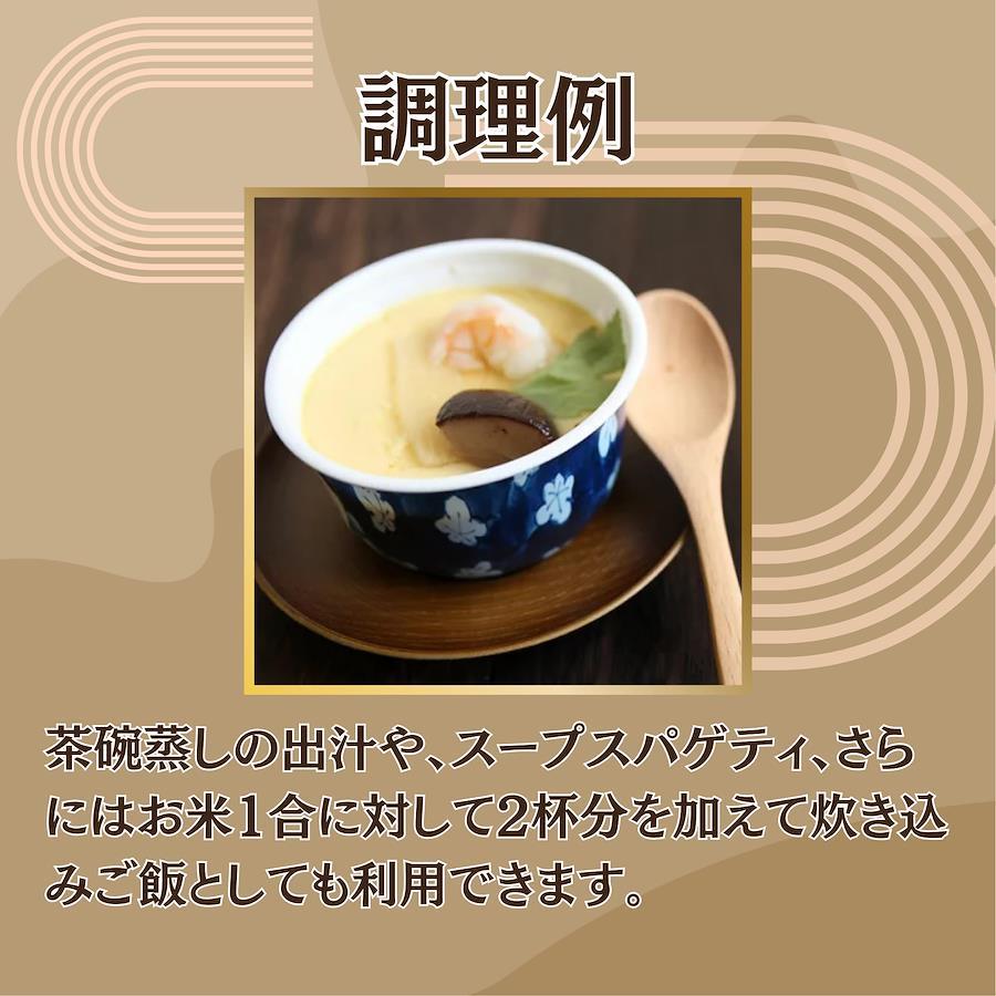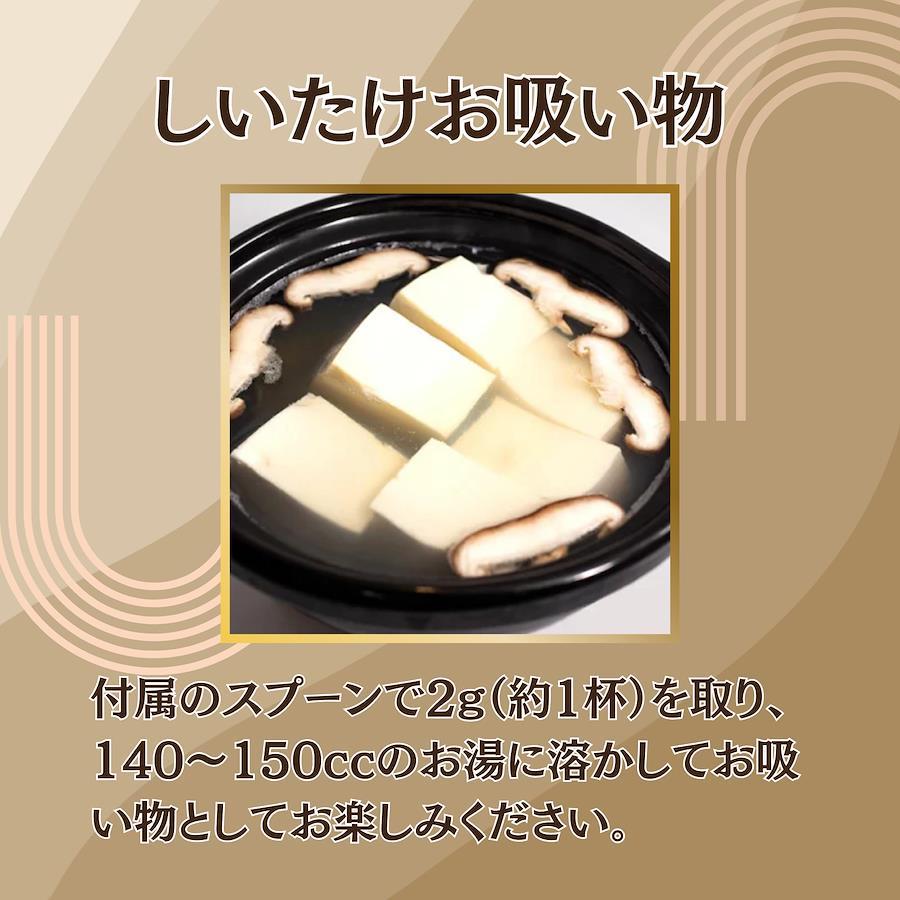 国産原木椎茸・国産原料を使用したしいたけのお吸い物です。 【お召し上がり方】 ①すり切り1杯(2g)を150ccのお湯で溶くだけで、簡単にお吸い物の出来上がりです。 ②お米一合に対してスプーン山盛り2杯を入れてお好みの具と炊き上げれば、美味しい炊き込みご飯に。 ③お吸い物とお好みのキノコを入れスープを作り、茹でたパスタを混ぜ合わせれば、美味しいスープパスタに。 その他、お味噌汁やお鍋、おでんや出汁巻き卵等、お好みの食べ方でお楽しみください。