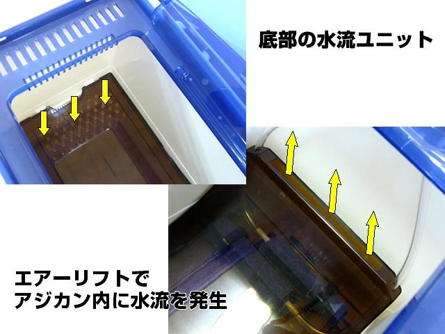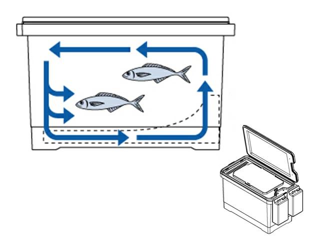 明邦独自のサイクロン方式を採用。エアーポンプから出る酸素を利用し、イケス内に水流を発生。