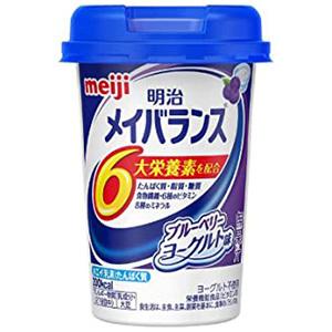 ■商品概要メーカー:明治商品名:【軽】メイバランスMiniカップ ブルーベリーヨーグルト味(125mL)区分:食品内容量:125mL商品概要:【栄養機能食品・亜鉛】酸味と甘みの絶妙なバランス!おいしく手軽に毎日の栄養バランスアップ!大事な栄養素が一度に摂れます!JANコード:4902705004368商品コード:127600513■商品の特徴明治だけのさわやかな酸味の栄養食。1本125mLで200kcalが摂れます。体に必要な栄養素をバランスよく配合した栄養組成。良質なホエイたんぱく質を100%使用■機能性関与成分亜鉛■原材料/成分/素材/材質デキストリン、乳清タンパク質、食用油脂(なたね油、パーム分別油)、難消化性デキストリン、ショ糖、食塩、食用酵母/pH調整剤、安定剤(増粘多糖類)、乳化剤、リン酸Ca、リン酸Mg、リン酸K、香料、塩化K、V.C、グルコン酸亜鉛、甘味料(スクラロース、ステビア)、V.E、硫酸鉄、ナイアシン、パントテン酸Ca、V.B6、グルコン酸銅、V.B1、V.B2、V.A、葉酸、V.B12、V.D、(一部に乳成分・大豆を含む)■賞味期限/使用期限(製造から)1年■メーカー希望小売価格(税込)248円■発売元/製造元/輸入元明治■お問い合わせ先株式会社明治フリーダイヤルで受け付けています。受付時間:9:00~17:00(土日祝日、年末年始除く)牛乳・飲料・ヨーグルト・デザート:0120-598-369おかし:0120-041-082アイスクリーム・冷凍食品・チーズ・一般食品他:0120-370-369乳児・幼児用商品:0120-358-369栄養食品・流動食(メイバランス他):0120-201-369スポーツ・美容・健康:0120-858-660くすり(一般用医薬品):0120-841-704※お電話のみの受付としています。https://www.meiji.co.jp/support/inquiry/