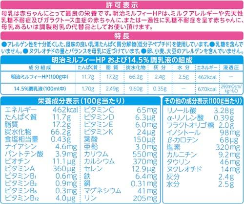 「明治ミルフィーHP」は、良質な乳清たんぱく質を酵素分解することによってアレルゲン性を十分低くした風味の良い低分子ペプチドをたんぱく質源としています。 乳糖を含んでいません。 乳児の成長発育に必要な脂質、炭水化物、ビタミン類、ミネラルを消化吸収されやすい形でバランス良く配合しており、ミルクアレルギーや先天性乳糖不耐症およびガラクトース血症の赤ちゃんに、または一過性に乳糖不耐症を呈す赤ちゃんに、母乳あるいは調製粉乳の代替品としてお使いいただけます。 「明治ミルフィーHP」は、ミルクアレルゲン除去食品、無乳糖食品として、消費者庁の認可をうけています。 1アレルゲン性を十分低くした、風味の良い乳清たんぱく質分解物(低分子ペプチド)を使用しています。-乳、卵、小麦、大豆のアレルゲンを含む原材料は使用していません。 2脂肪酸組成をできるだけ母乳に近づけながら、脂質の消化吸収性が高まるように、また消化管への刺激を低減するように配慮しています。 3ビオチン、カルニチンを新たに配合しました。 4乳糖を含んでいません。-炭水化物としてデキストリンを使用しています。 5ビタミンD、ビタミンK等のビタミン類を配合しています。 6カルシウムやリン等、ミネラルの量と相互のバランスを調整しています。 7ヌクレオチドの量とバランスを母乳に近づけています。 商品につきまして問題がございましたら、お手数ですが下記までご連絡いただきますようお願いいたします。 「株式会社 明治お客様相談センター」 フリーダイヤル: 0120-358-369 受付時間:月~金 9:00~17:00 (土日祝日 年末年始 夏季休暇を除く)
