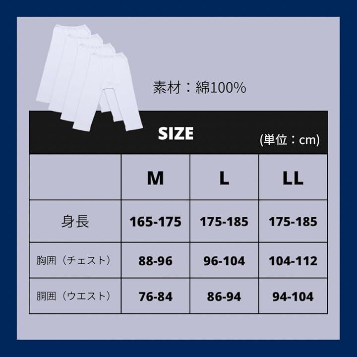 「サイズ」M(ウエスト)76-84cm/(胸囲)88-96cm/(身長)165-175cm、L(ウエスト)86-94cm/(胸囲)96-104cm/(身長)175-185cm、LL(ウエスト)94-104cm/(胸囲)104-112cm/(身長)175-185cm 「素材」綿100% フライス編み