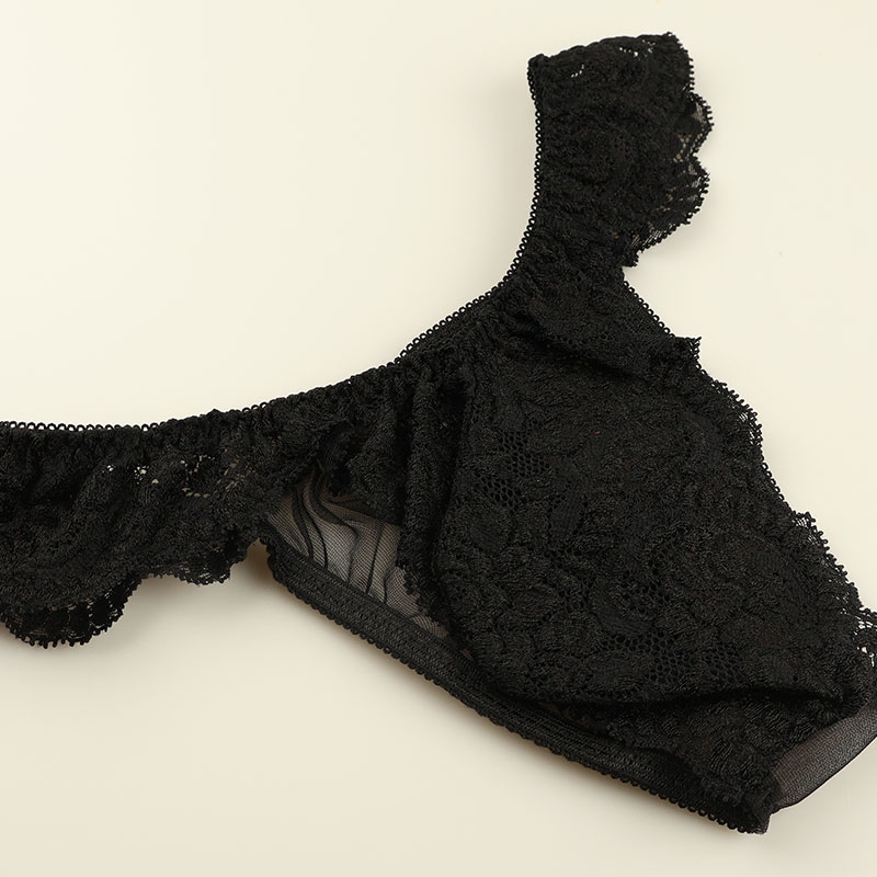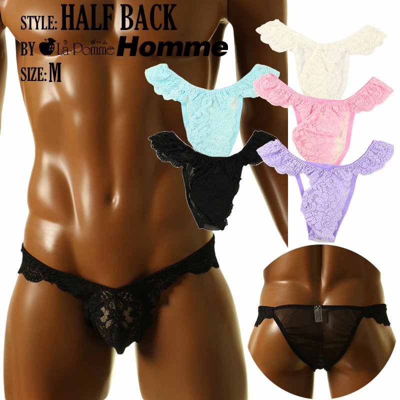 華やかで軽やかな質感を持ち、柔らかな触り心地と優美な透け感が魅力的なセクシーなシースルー素材の20ハーフ生地を使用したハーフバックビキニになります。伸縮性があり美しく綺麗なレースデザインで女性用下着の様なエレガントでフェティッシュな下着になります。