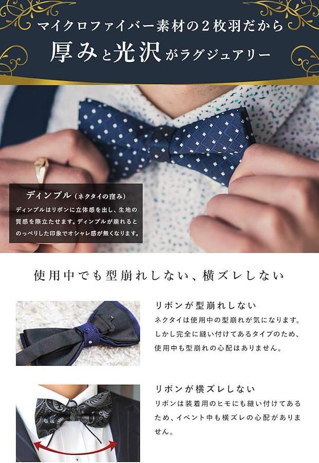 本製品は蝶部分が糸で縫い付けて固定され、紐部分をフックで装着出来るようにしたワンタッチタイプの蝶ネクタイです。