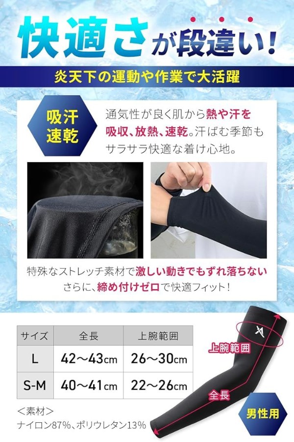 「ズレない・蒸れない」を追求した快適設計」ロング丈&高弾性: 二の腕までをカバーするロング設計。