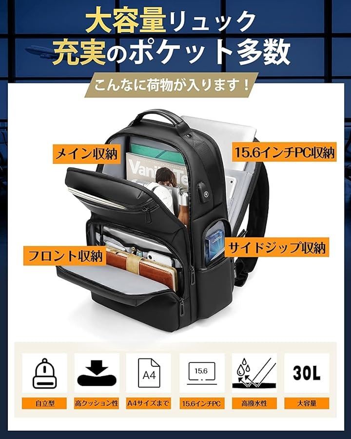 自立型リュックで、機内に持ち運び可能です。