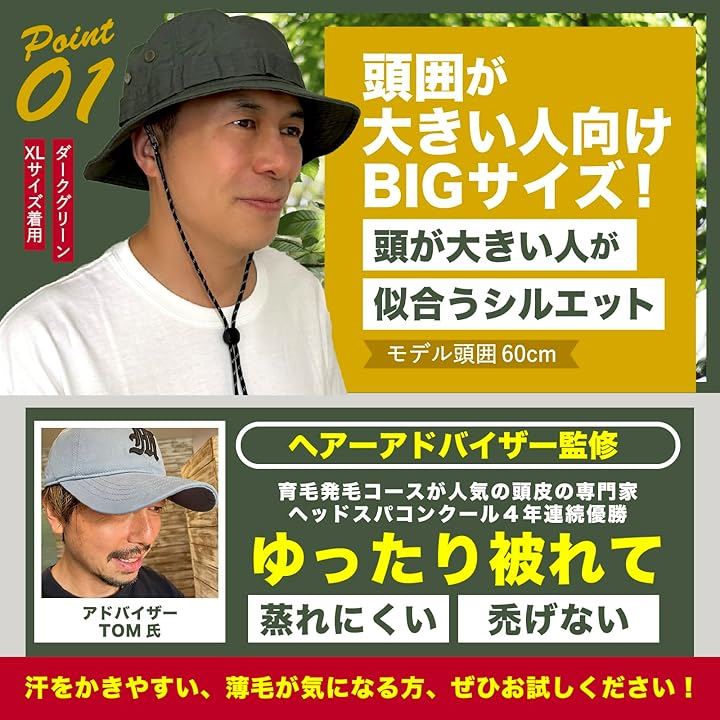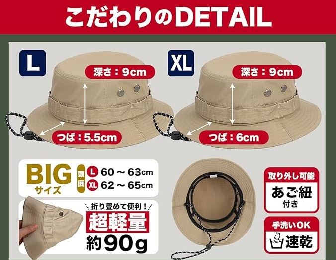 「たっぷり大き目のXLサイズ」:頭囲62~65cm、縦31cm、横31cm、つばの長さ6.0cm、高さ9cm、重さ約90g(あご紐含む97g)