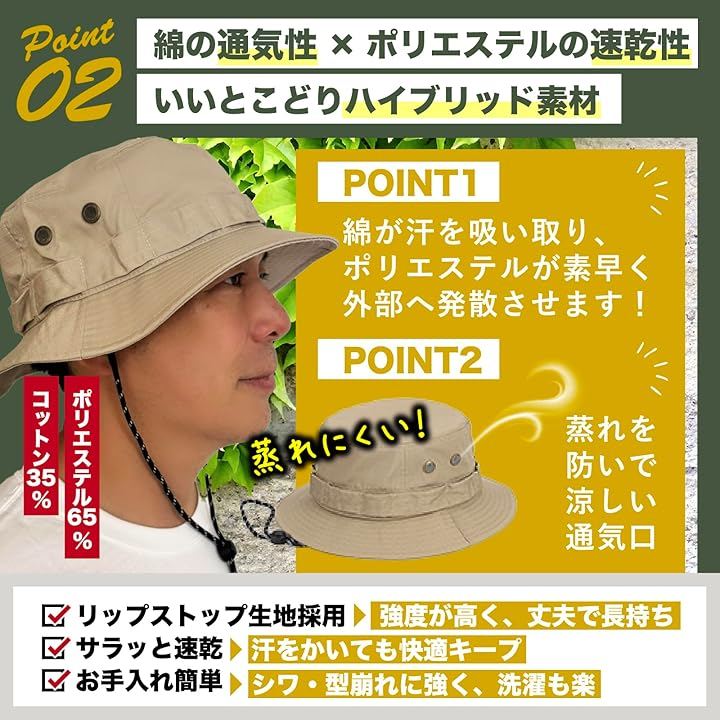 「風の日も安心。2WAY仕様の着脱式あご紐」:コードストッパー付きでしっかり固定できるあご紐は、風に飛ばされる心配を軽減。