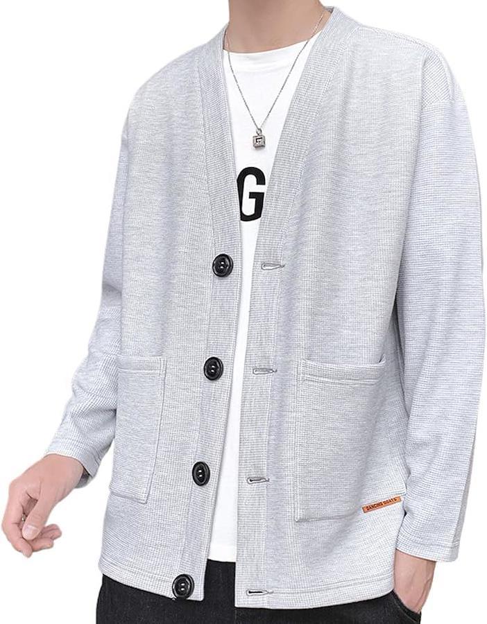 本品は、凹凸のあるワッフル調生地を採用したメンズ前開きカーディガン。