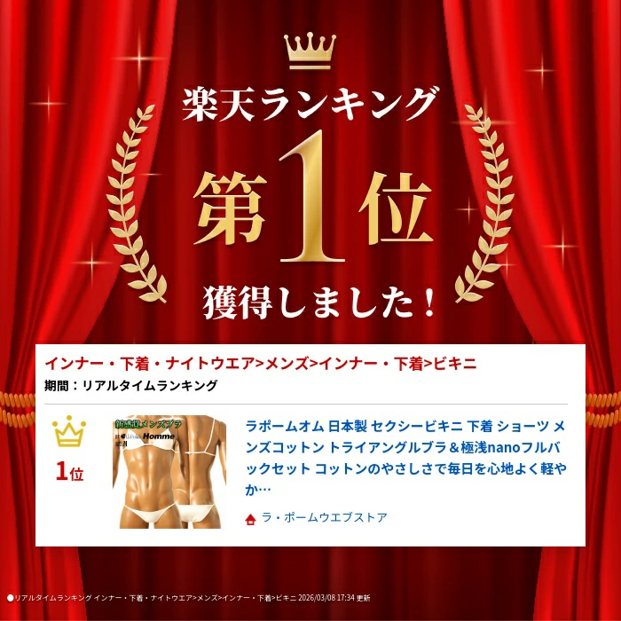 通気性に優れ、やさしく肌に馴染むコットン生地を使用したメンズ上下セット。さらりとした着用感で、デイリーにも快適にお楽しみいただけます。トップスはメンズでは珍しい三角ブラタイプを採用。シンプルながらも程よいフィット感で、スタイリッシュかつ個性的な印象を演出します。ボトムはハイパーローライズ仕様のnanoフルバックビキニ。股上の置き寸は約14cmと浅めに設計され、ウエストラインをすっきりと見せながら、身体のラインを美しく引き立てます。上下ともにコットンならではの柔らかさと伸縮性があり、リラックスタイムからファッション性を楽しみたいシーンまで幅広く活躍するセットです。