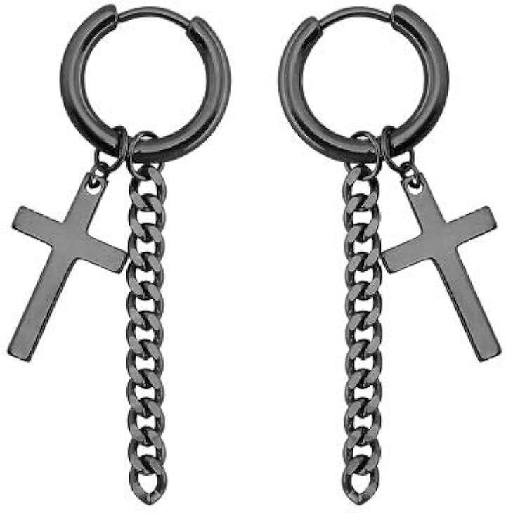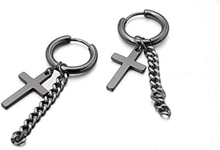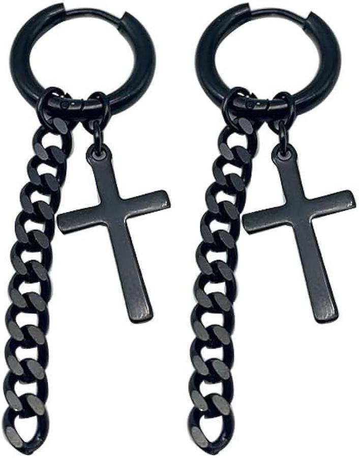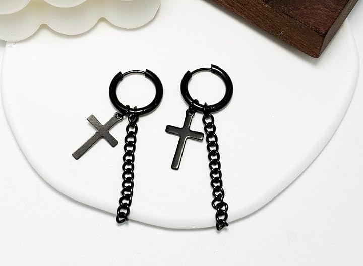ブラックカラーのフープに、揺れる十字架チャームがアクセントとなり、さりげなく存在感を放ちます。