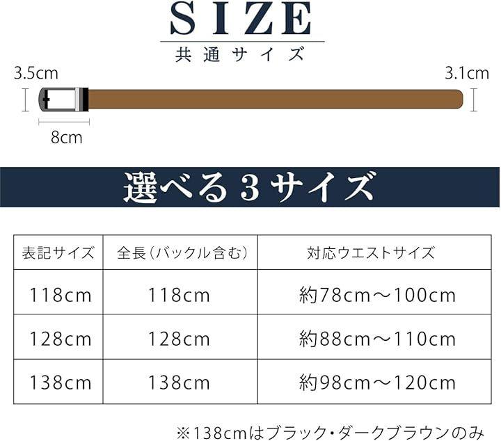 「サイズ」全長(バックル含む):118cm/128cm/138cm 幅3.1cm(31mm) バックルのみ:8cm/幅3.5cm(35mm)