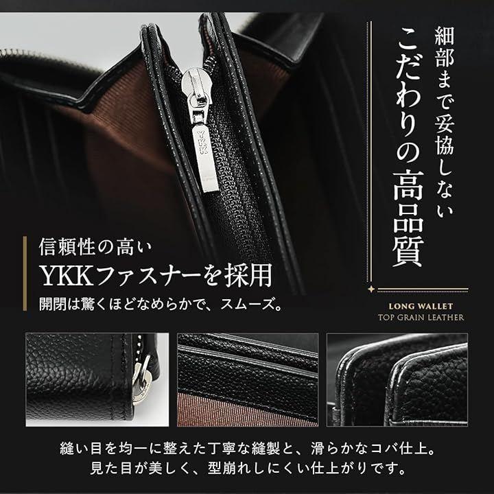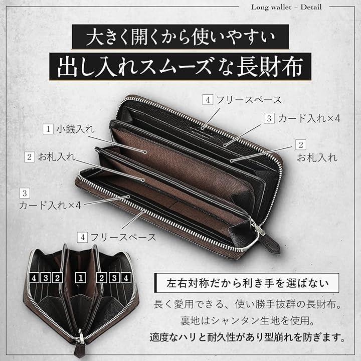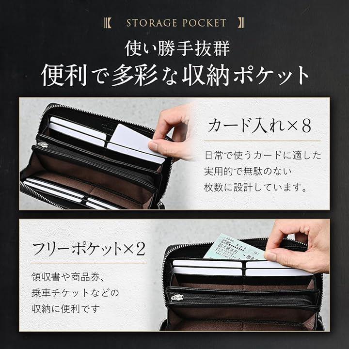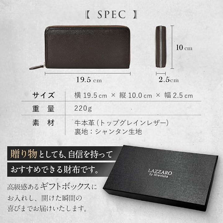 「5. サイズ・重量・ギフト対応」 サイズ:横19.5cm x 縦10.0cm x 厚み2.5cm 重量:約220g 素材:牛本革(トップグレインレザー)、裏地:シャンタン生地 高級感のある専用ギフトボックス入りで、贈り物としても最適。