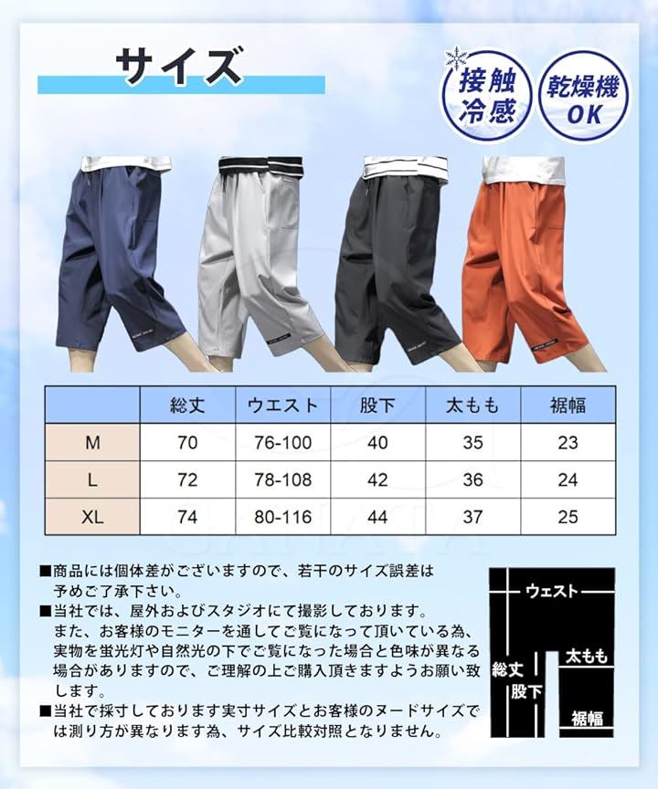 「使いやすいにこだわり」(1)ウェスト紐調節可能-お好みのサイズに変更でき、幅広いサイズに対応(2)便利なサイドポケット-深さ約23センチでスマホや財布を入れるのに便利(3)ひざ下丈-ひざ下丈でロングシーズン履きやすい(4)シンプルなバックポケット-スクエア型のバックポケットで深さ約18センチ(5)洗濯機乾燥機対応でお手入れもラクラク。汗をかいても洗濯で清潔。デイリー使いに。