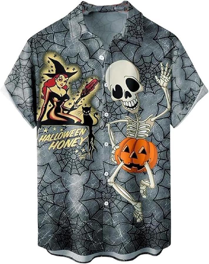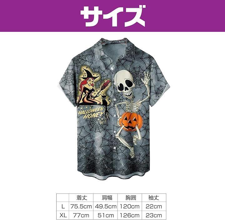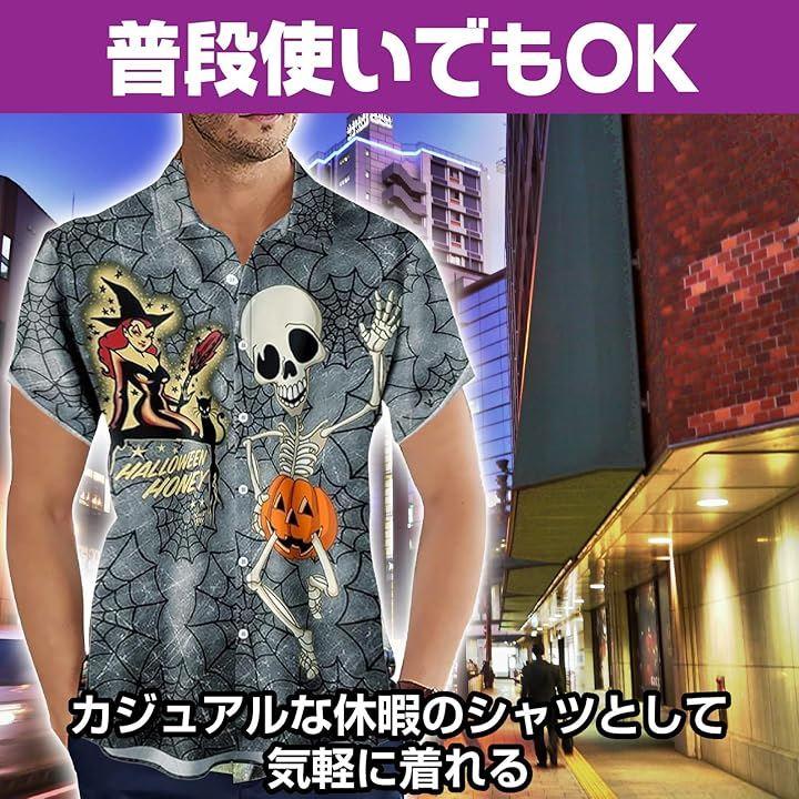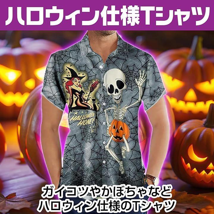 「商品説明」ハロウィンを盛り上げるホラーデザインシャツ:ハロウィンの仮装やパーティーにぴったりな、魔女やガイコツなどホラー柄を大胆にプリントした開襟シャツ。