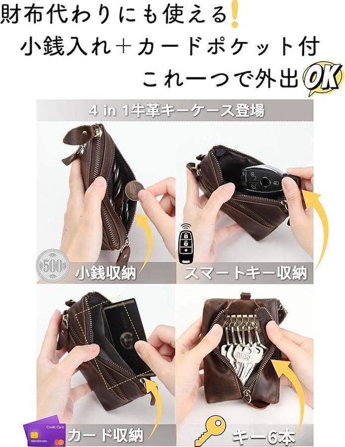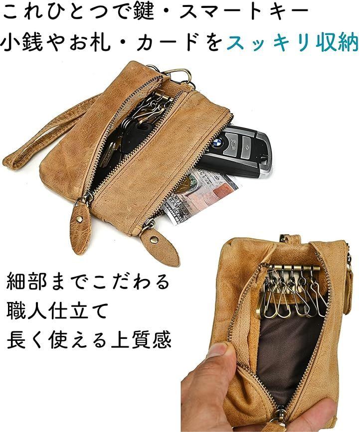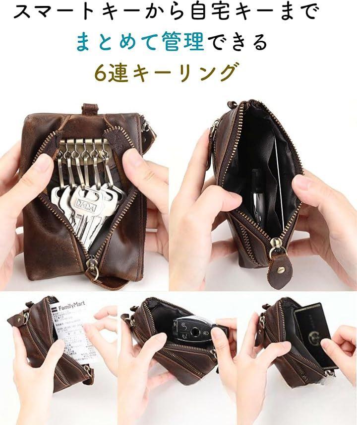 6連フックで鍵を整理し、コインケースやカード収納付きで財布代わりにもなる便利設計。