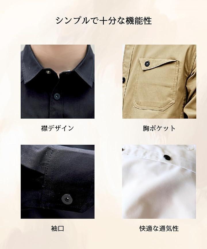 「商品の特徴」コットン100%、長袖、カジュアル、無地、スナップボタン、春秋冬、胸ポケット、前開き。