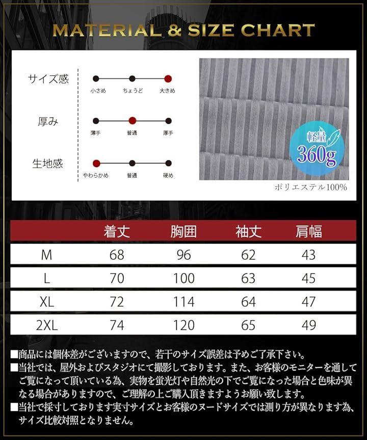 size:着丈/胸囲/袖丈/肩幅「M」68/96/62/43「L」70/100/63/45「XL」72/114/64/47「2XL」74/120/65/49 *サイズに若干の誤差が生じる場合がございますのでご了承ください。